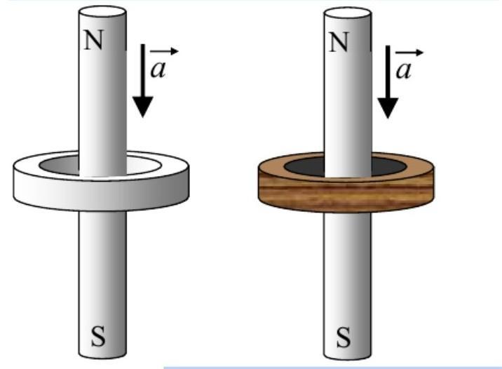 1.На обеих стадиях падения стержня сквозь металическое кольцо его ускорение меньше g.Деревянное же кольцо не влияет на ускорение пролетающего сквозь него стержня. 2. При приближении намагниченного стержня к кольцам магнитный поток свозь каждое кольцо возрастает,а при удалении от них после пролёта сквозь кольца уменьшается,и согласно закону элктромагнитной индукции в них создаётся ЭДС индукции.