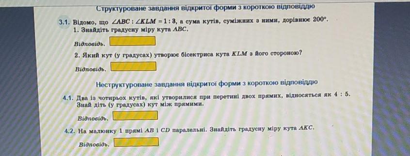 похоже. что там пересекаются две прямые, при пересечении получаем четыре угла сумма двух смежных 200°, всего сумма четырех равна 360°, значит, на долю двух других приходится 360°-200°=160°, на одну часть приходится 160°/(1+3)=40°, значит угол АВС 40°,∠ КLM=3*40°=120°, биссектриса его делит на две равные части по 60°, этот угол образует сторона данного угла с биссектрисой.
