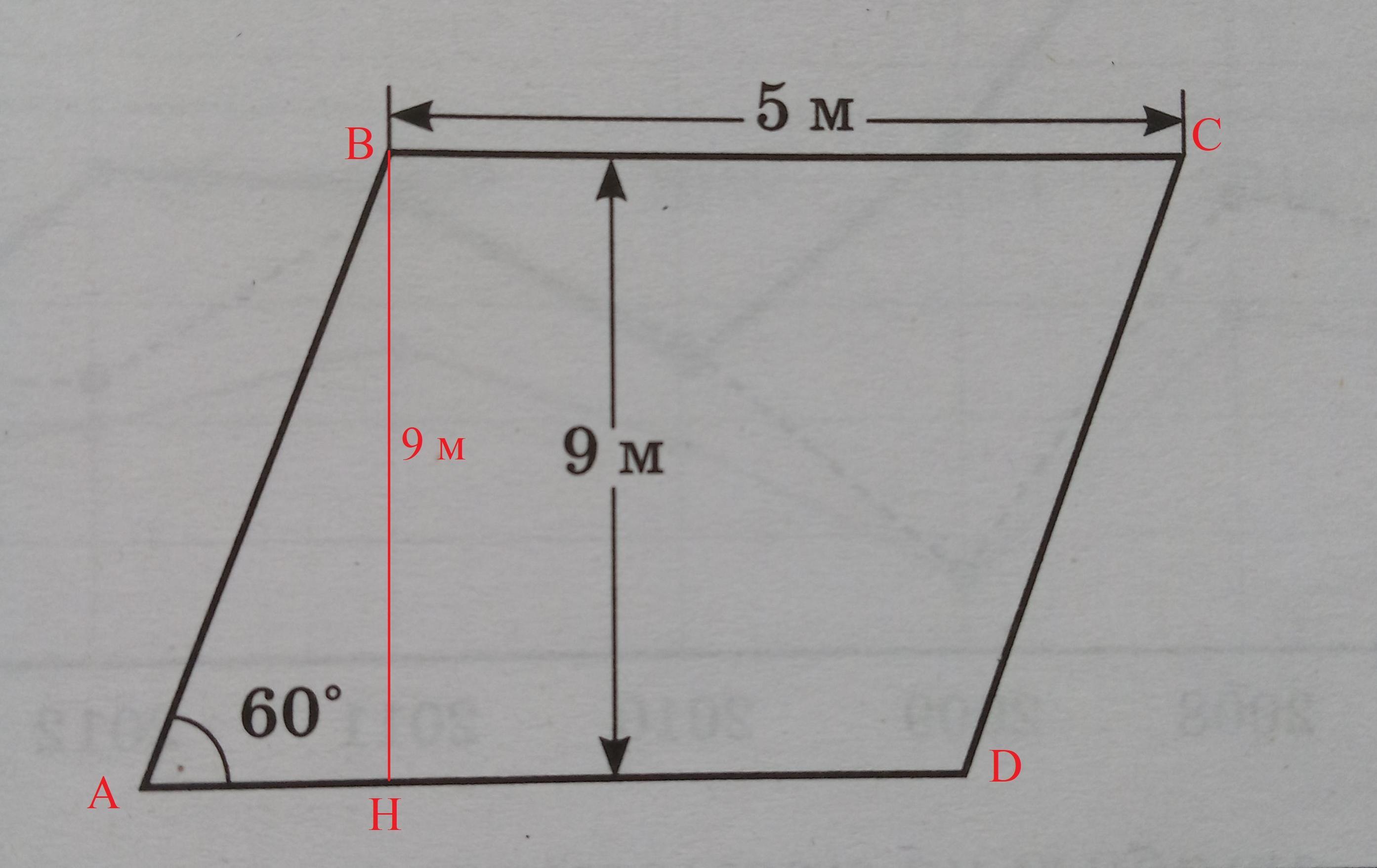 Судя по рисунку, клумба представляет собой параллелограмм, одна сторона которого равна 5 м, а высота - то есть расстояние между противолежащими сторонами, равна 9 м.