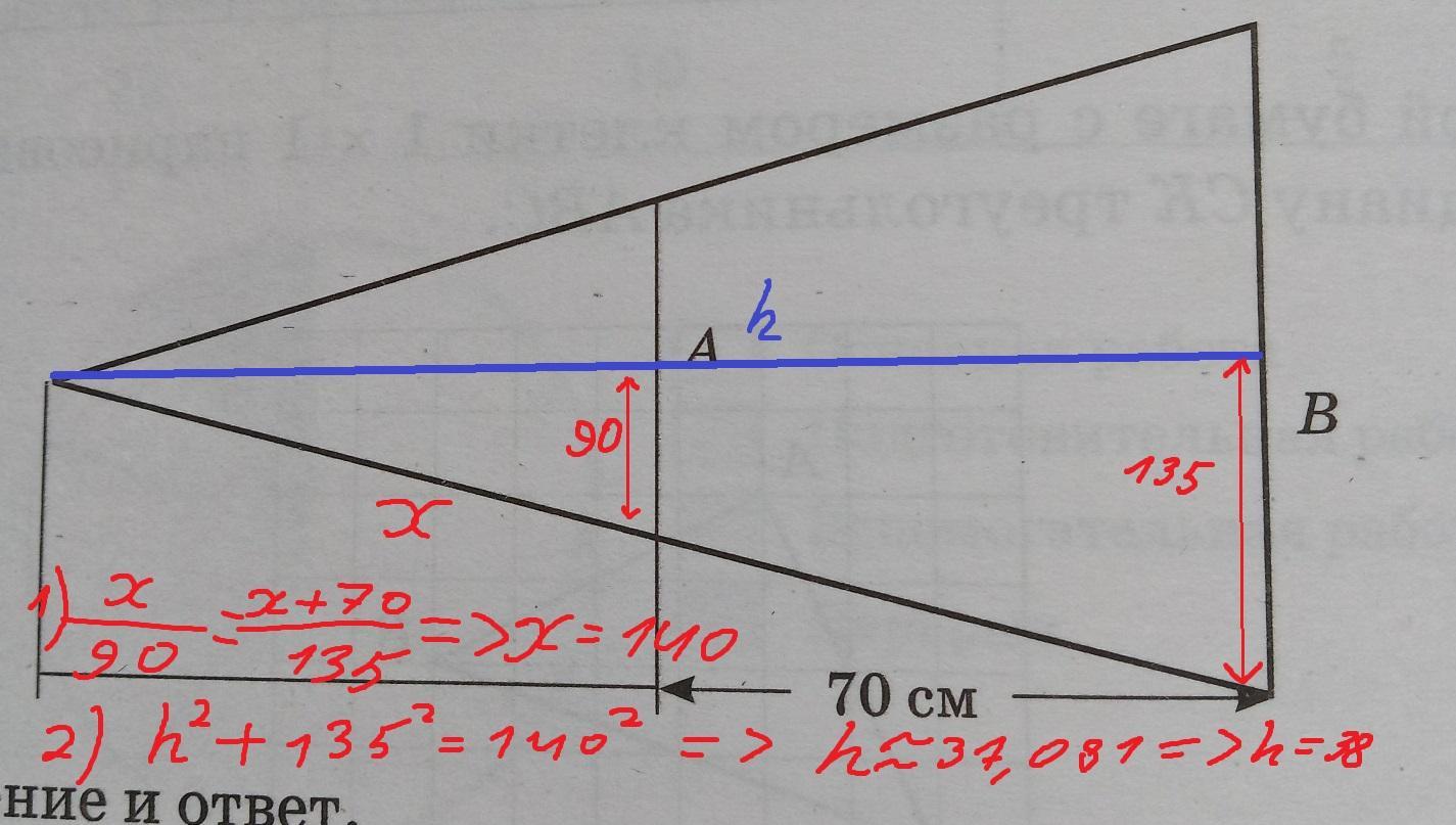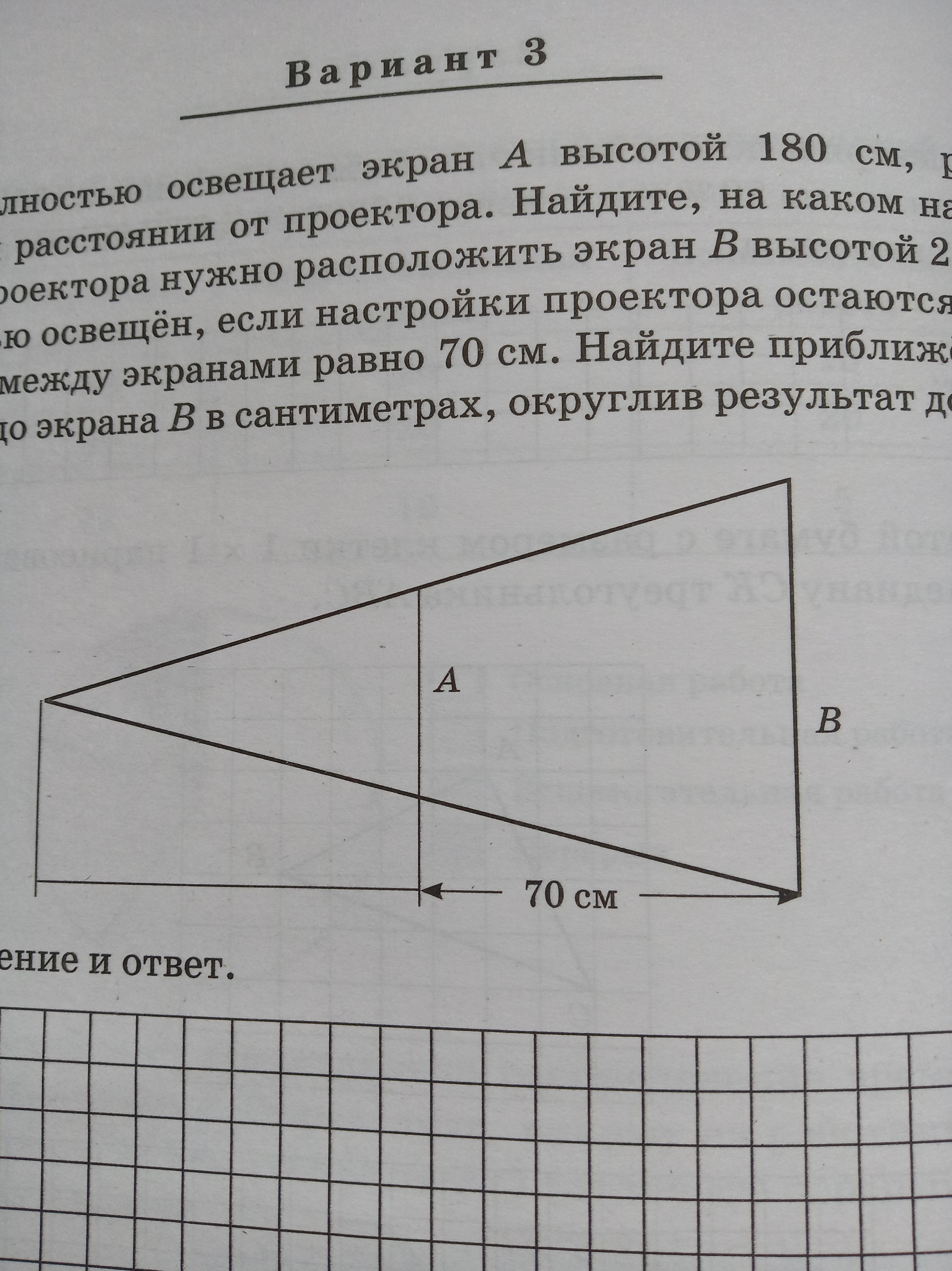 Проектор полностью освещает экран А высотой 180 см, расположенный на некотором расстоянии от проектора. Найдите, на какой наименьшем расстоянии от проектора нужно расположить экран В высотой 270 см, чтобы он был полностью освещен, если настройки проектора остаются неизменными, а расстояние между экранами равно 70 см. Найдите приближенно расстояние от проектора до экрана В в сантиметрах, округлив результат до единиц.
