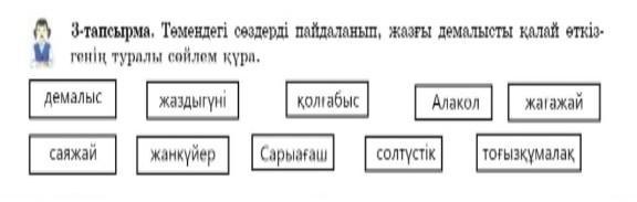 Біз жаздыгүні бәріміз демалысқа шығамыз.Мен ауылда атам қолғабыс боламын. Ата-әжем мені Алакөл жағажайына апаратын.Саяжайға барғанда ол жерде тоғызқұмалақ жарысы өткізіледі екен.Жанкүйерлер өте көп болады.Және де Алакөлдің солтүстік жағында Сарыағаш сауықтыру кешені бар.