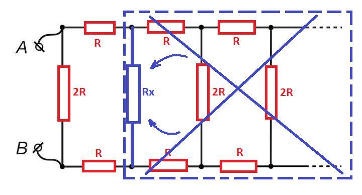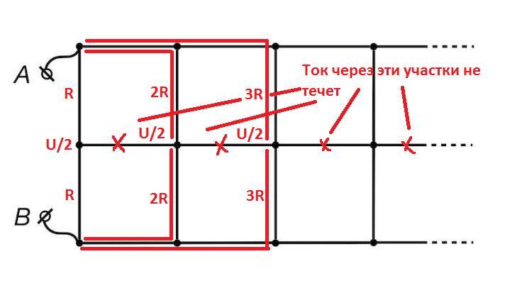 Обратим внимание на то, что потенциалы центральных узлов одинаковы. Действительно, по каждую сторону от узла находится одно и то же сопротивление, значит в узле напряжение делится пополам (см. рисунок). Перемычки можно исключить. Получившаяся цепь уже проще. Отбросим бесконечную часть цепи, заменив ее на Rx, очевидно, что и сопротивление всей цепи будет равно Rx, ведь отбрасывание одного повторяющегося участка от бесконечной цепи не изменит ее сопротивления, опираясь на это, составим уравнение: