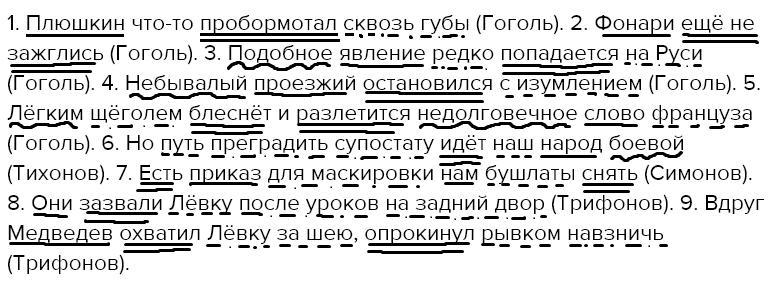 1. Плюшкин что-то пробормотал сквозь губы (Гоголь). 2. Фонари ещё не зажглись (Гоголь). 3. Подобное явление редко попадается на Руси (Гоголь). 4. Небывалый проезжий остановился с изумлением (Гоголь). 5. Лёгким щёголем блеснёт и разлетится недолговечное слово француза (Гоголь). 6. Но путь преградить супостату идёт наш народ боевой (Тихонов). 7. Есть приказ для маскировки нам бушлаты снять (Симонов). 8. Они зазвали Лёвку после уроков на задний двор (Трифонов). 9. Вдруг Медведев охватил Лёвку за шею, опрокинул рывком навзничь (Трифонов).