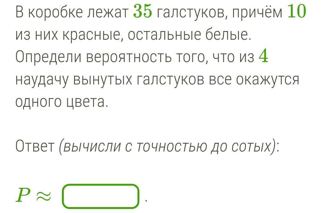 В коробке лежат 35 галстуков, причём 10 из них красные, остальные белые. Определи вероятность того, что из 4 наудачу вынутых галстуков все окажутся одного цвета. Ответ (вычисли с точностью до сотых)