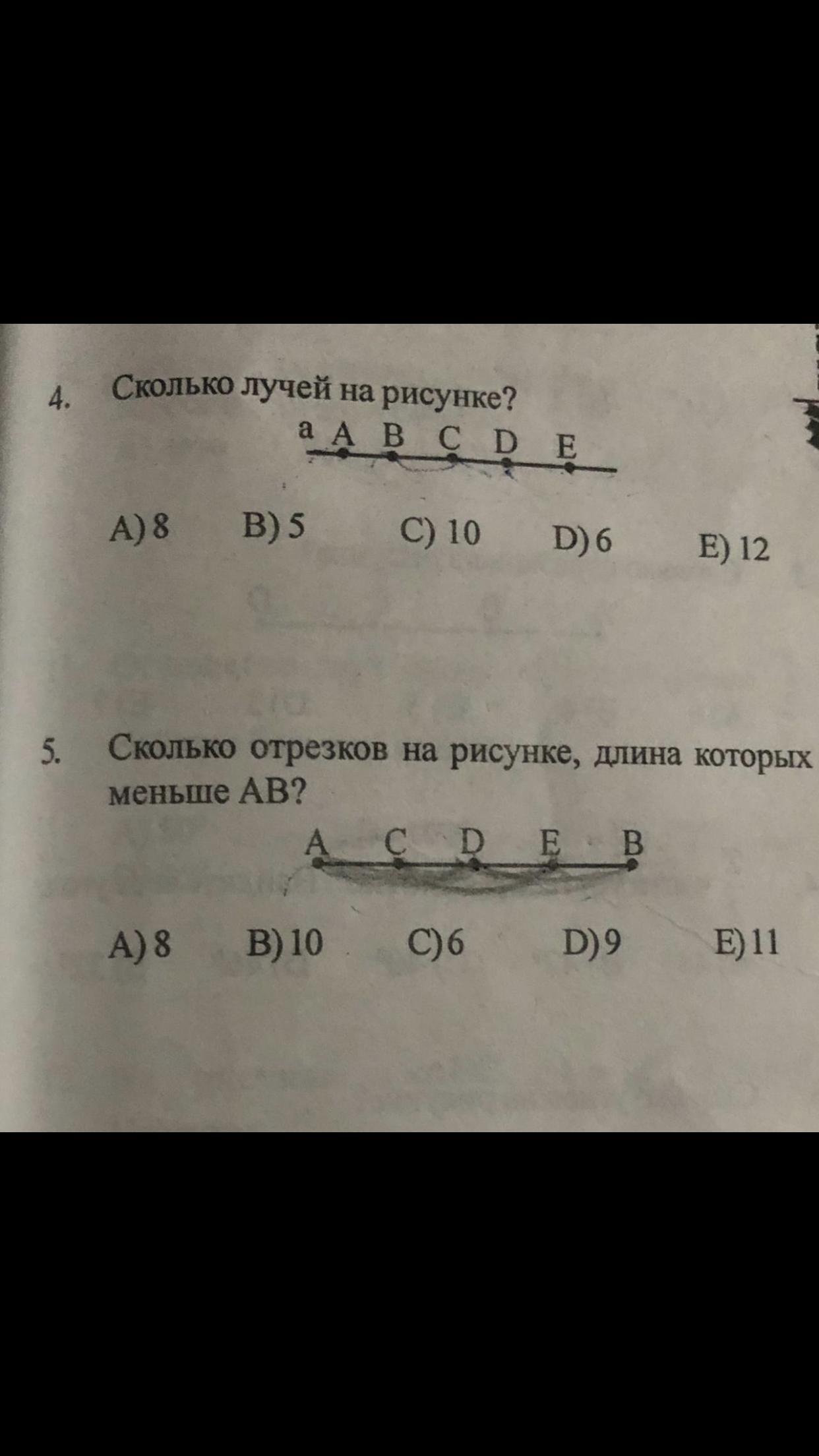 4. 10 лучей (каждая точка делит прямую на два луча, поскольку точек 5 лучей - 10)