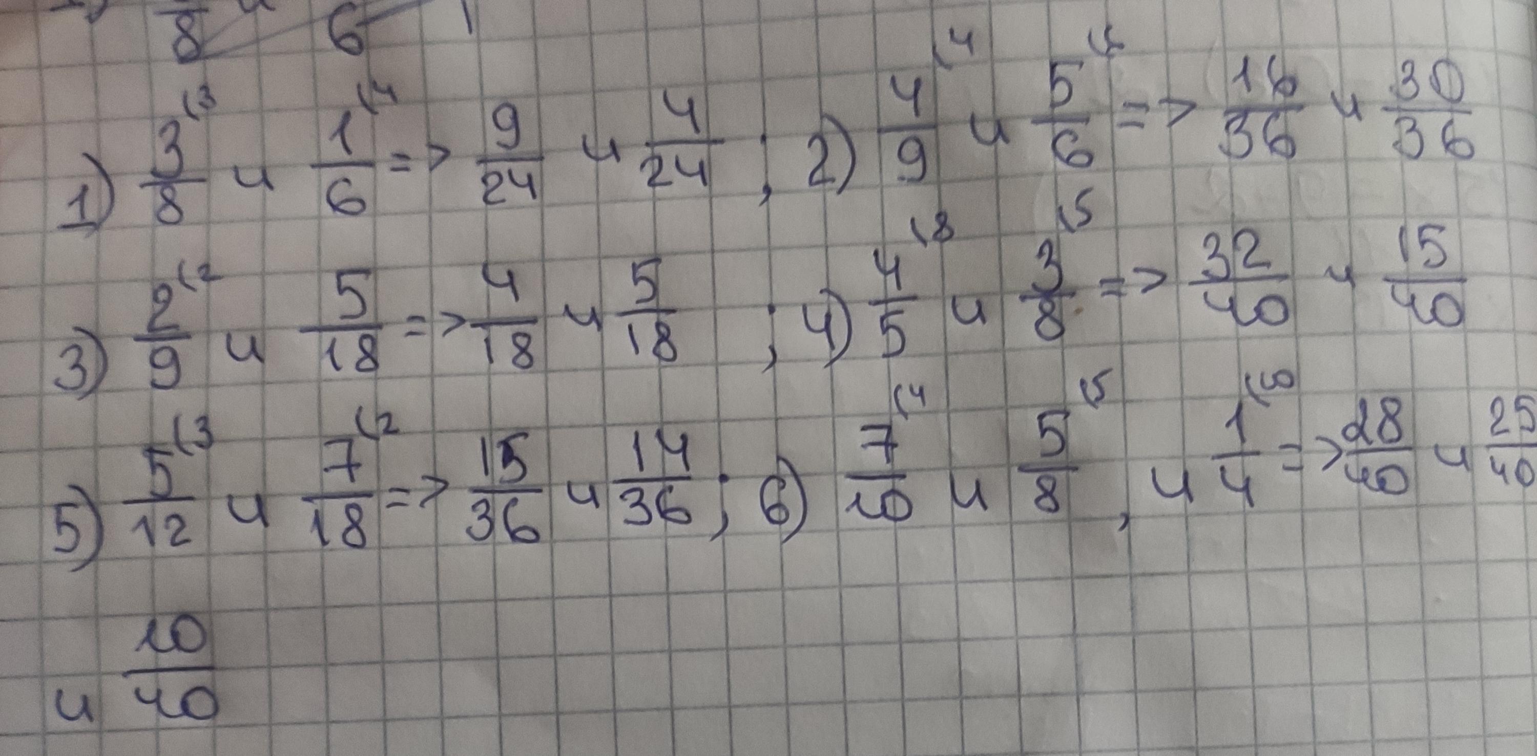привидите к наименьшому общему знаменателю дроби: 1) 3/8 и 1/6 2) 4/9 и 5/6 3) 2/9 и 5/18 4) 4/5 и 3/8 5) 5/12 и 7/18 6) 7/10 ; 5/8 и 1/4