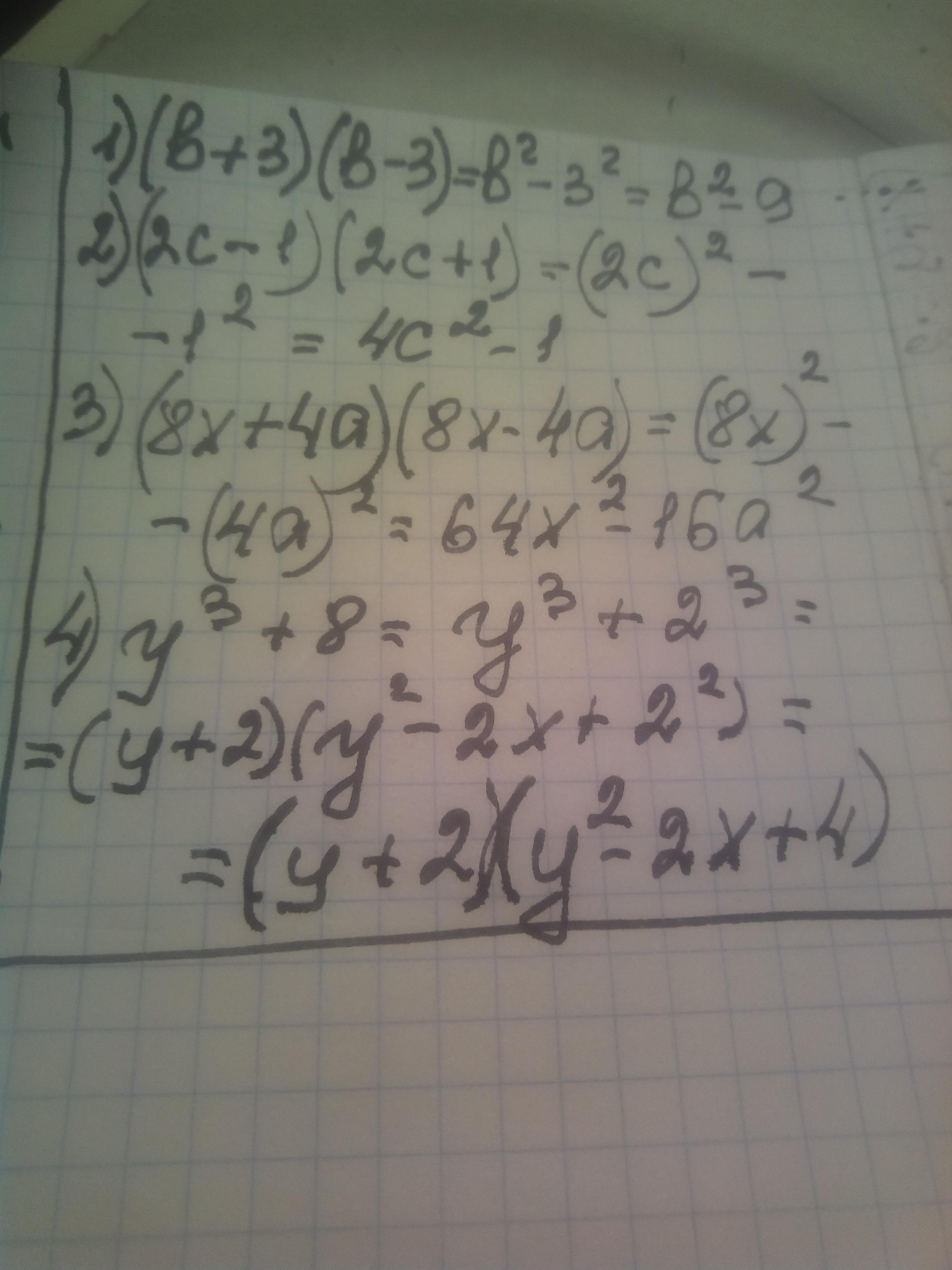 №2. Упростите выражения ( используя формулу) 1) ( в+3)(в-3) 2) (2с -1)(2с+1) 3) (8х+4а)(8х-4а) №3. Представьте в виде произведения ( используя формулу) у 3 + 8 можно срочно пожалуйста