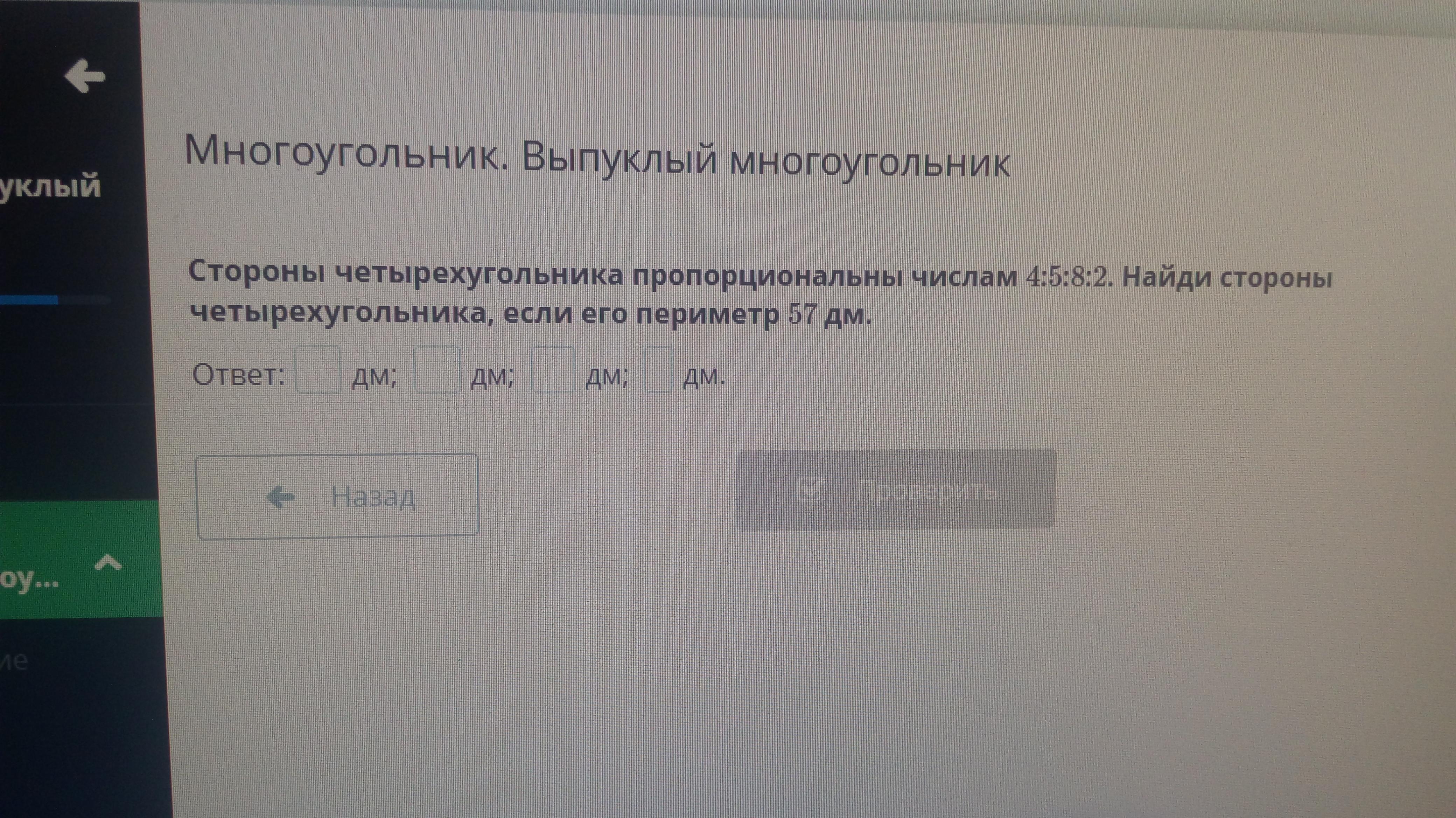 Стороны четырехугольника пропорциональны числам: 4 : 5 : 8 : 2, т.е одна сторона содержит 4 части, вторая - 5 частей, третья - 8 частей и четвертая - 2 части.