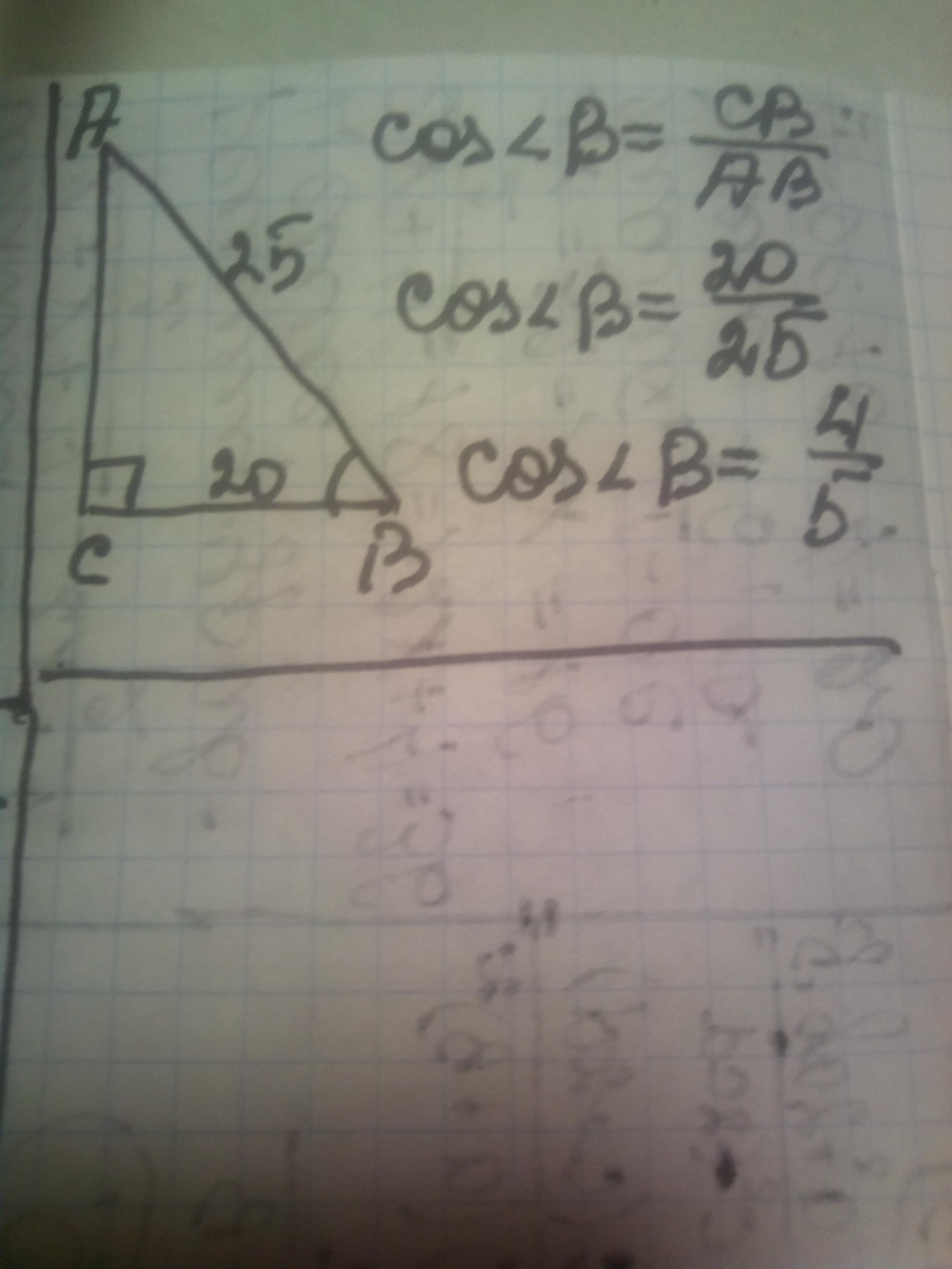 косинус- отношение прилежащего катета к гипотенузе, тоесть косинус в=20/25=4/5=0,8