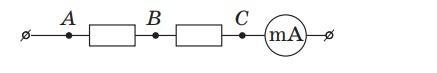 15.16 ПОМОГИТЕ ПЖЖ!!! коло складається з двох послідовно з'єднаних ре- зисторів опорами R = 12 Ом і R = 4 Ом (див. ри- сунок). Міліамперметр показує силу струму в колі 8 мА. Якими будуть показання вольтметра, підклю- ченого між точками А і В? В і С? Ai С?