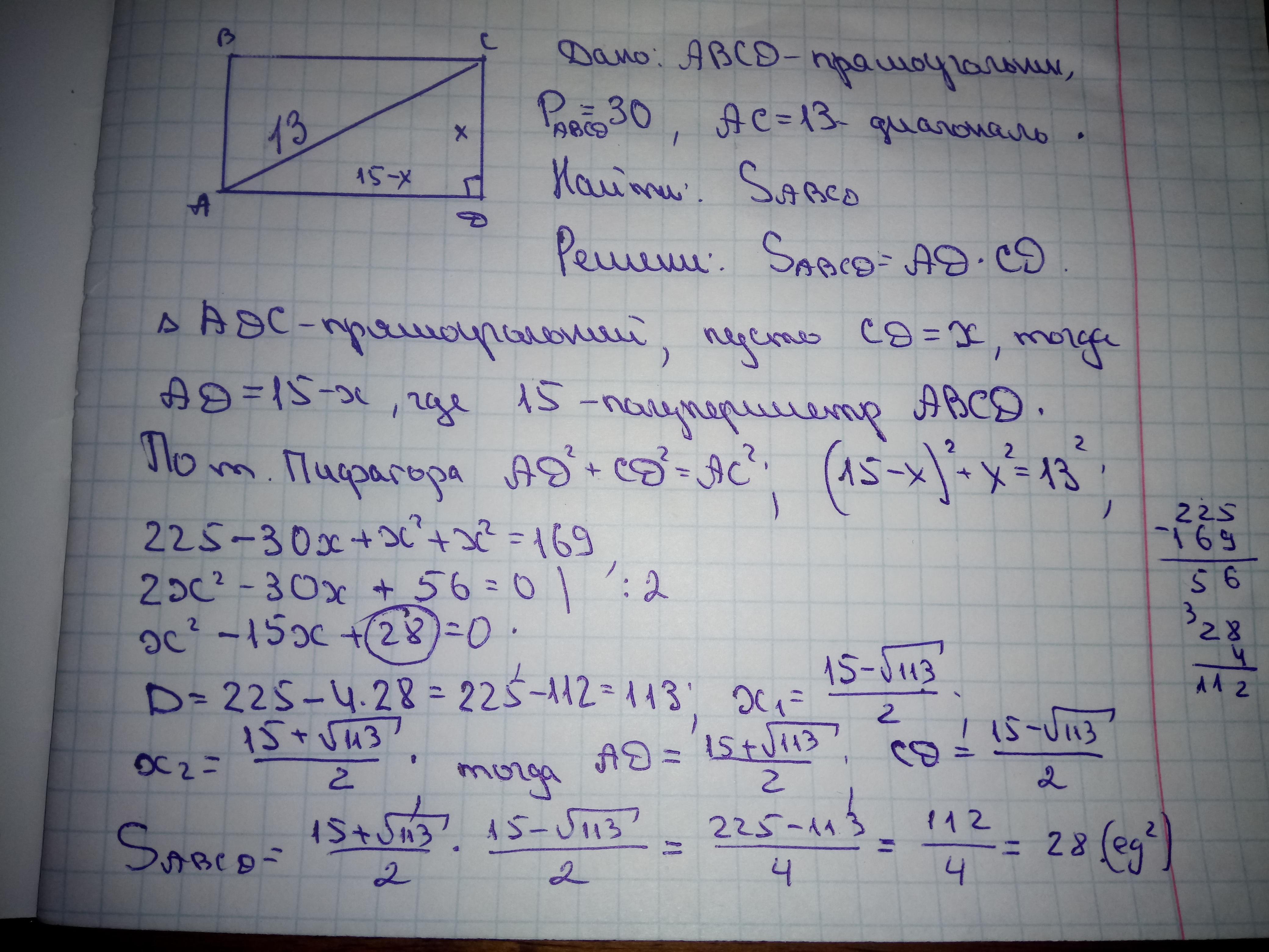 =(15±√113)/2; х= (15+√113); х= (15-√113); Если одна сторона х= (15+√113)/2; то вторая 15-(15+√113)/2 =(15-√113)/2. Если же х=(15+√113)/2, то вторая 5-(15-√113)/2=(15+√113)/2, тогда площадь произведение данных смежных сторон.