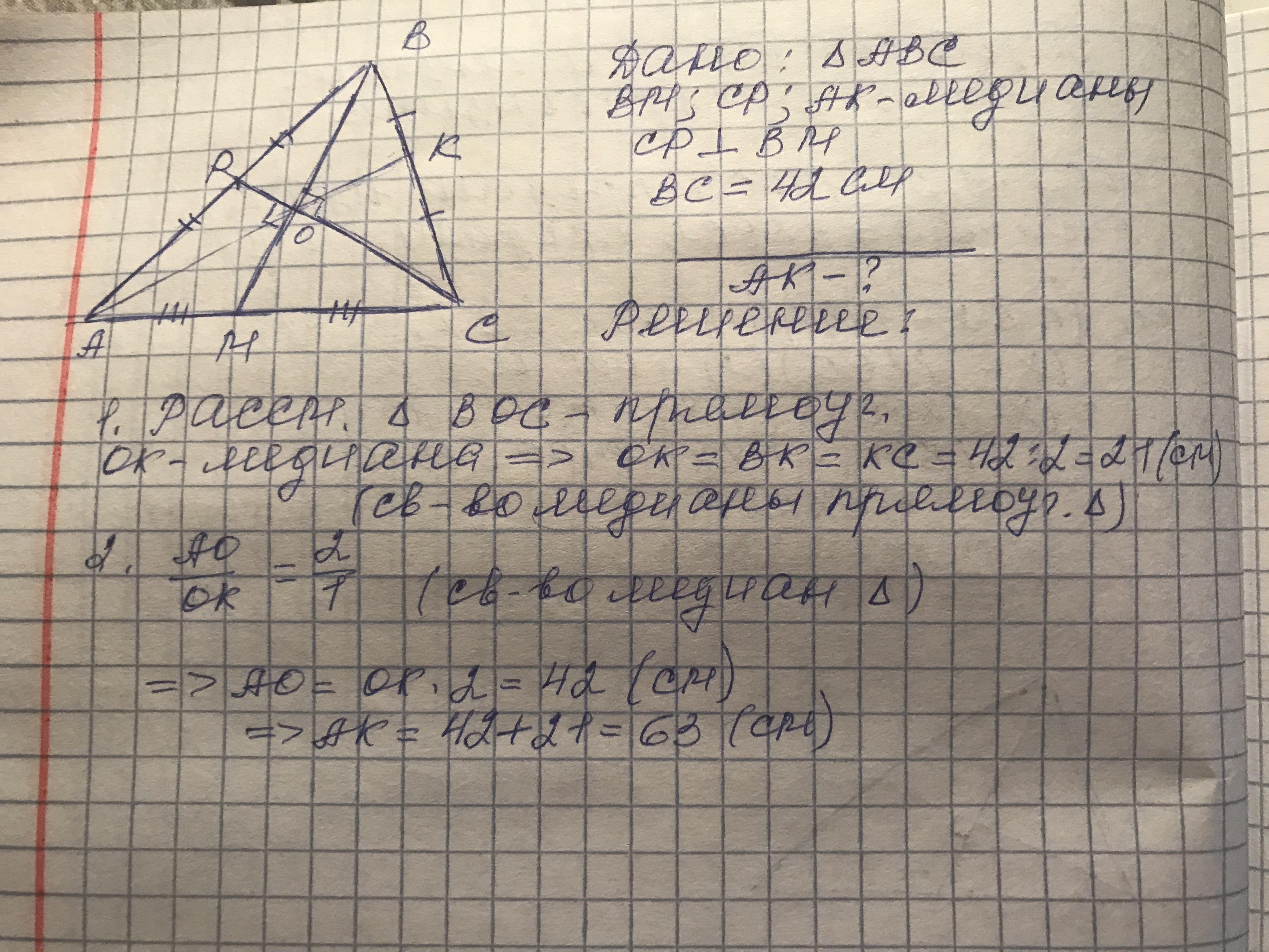 Медианы треугольника АВС,проведённые из вершин В и С,пересекаются под прямым углом.Найдите длину медианы треугольника,проведённой из вершины А,если ВС=42 см