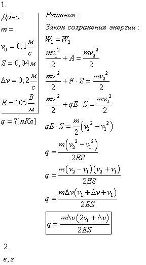 1. Пылинка, имеющая массу 10-6 кг, влетела в однородное электрическое поле вдоль его силовых линий с начальной скоростью 0,1 м/с и переместилась на расстояние 4 см. Чему равен заряд пылинки, если ее скорость увеличилась на 0,2 м/с при напряженности поля Е = 105 В/м? Ответ выразите в пикокулонах (пКл) (в ответ запишите только числовое значение).