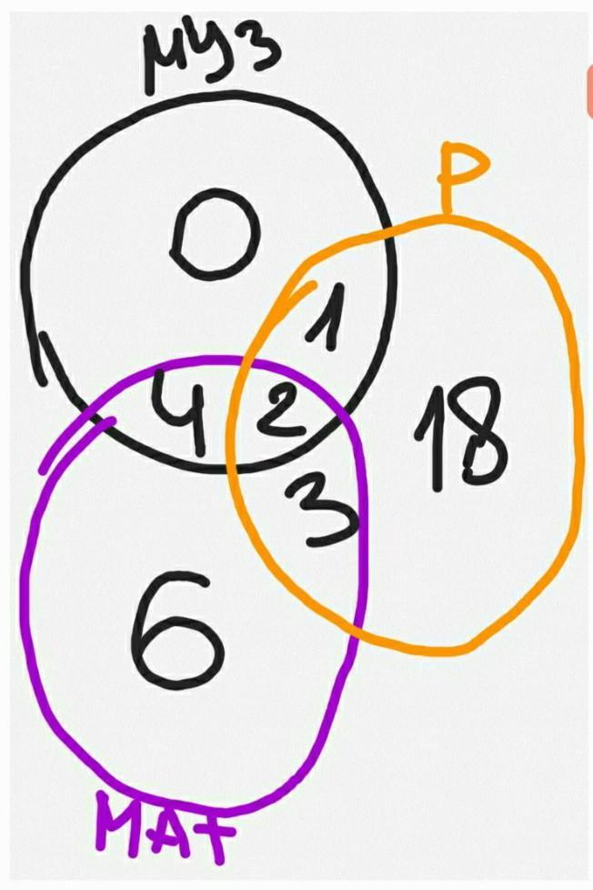 В школе работают кружки по музыке, рисованию и математике. На кружок по музыке ходит 7 шестиклассников, по рисованию – 24, по математике – 15. При этом каждый шестиклассник ходит хотя бы в один кружок, а на три кружка сразу ходят двое. На кружок по музыке и рисованию одновременно ходят 3 шестиклассника, по музыке и математике - 6, а по математике и рисованию – 5 (причем посчитаны и те шестиклассники, которые ходят на все три кружка сразу). Сколько шестиклассников в школе?