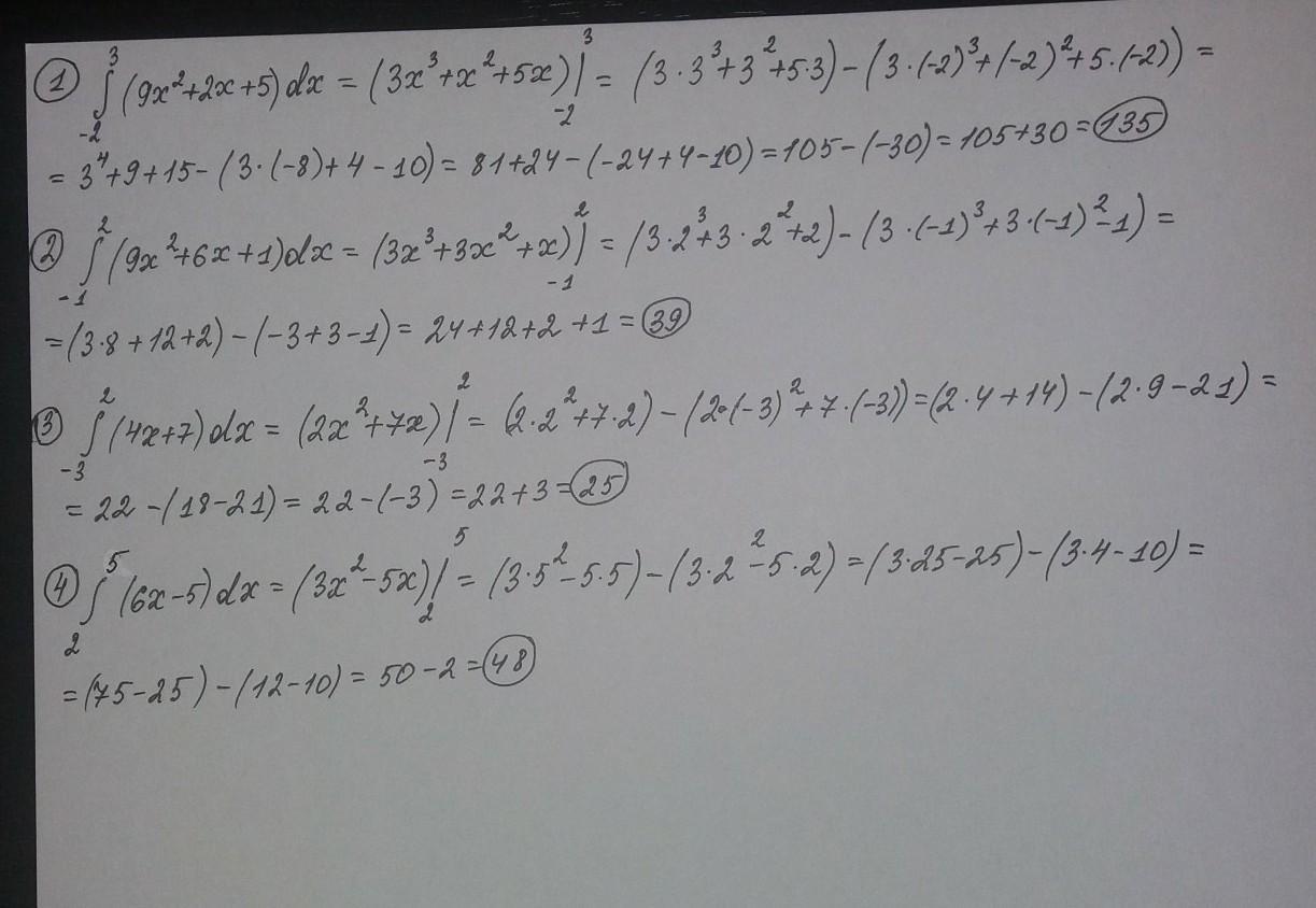 1) 9х³/3+2х²/2+5х=3х³+х²+5х, по формуле Ньютона - Лейбница найдем определенный интеграл. 3*3³+3²+5*3-(-24+4-10)=105+30=135