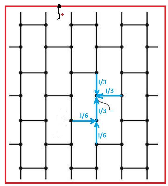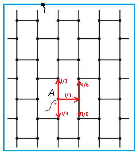 Воспользуемся следующим приемом (метод наложения токов). Сначала оставим подключенной только точку А, при том подключим ее к положительному полюсу источника, а отрицательный полюс подключим к периметру сетке на бесконечности. Построим распределение токов в этому случае (первый рисунок). Затем подключим точку В к отрицательному полюсу источника, а положительный полюс удалим на бесконечность, снова построим распределение токов в ближайших ветвях (второй рисунок). Токи при одновременно подключенных точках А и В получим суммированием полученных токов (третий рисунок). Напряжение между точками А и В: