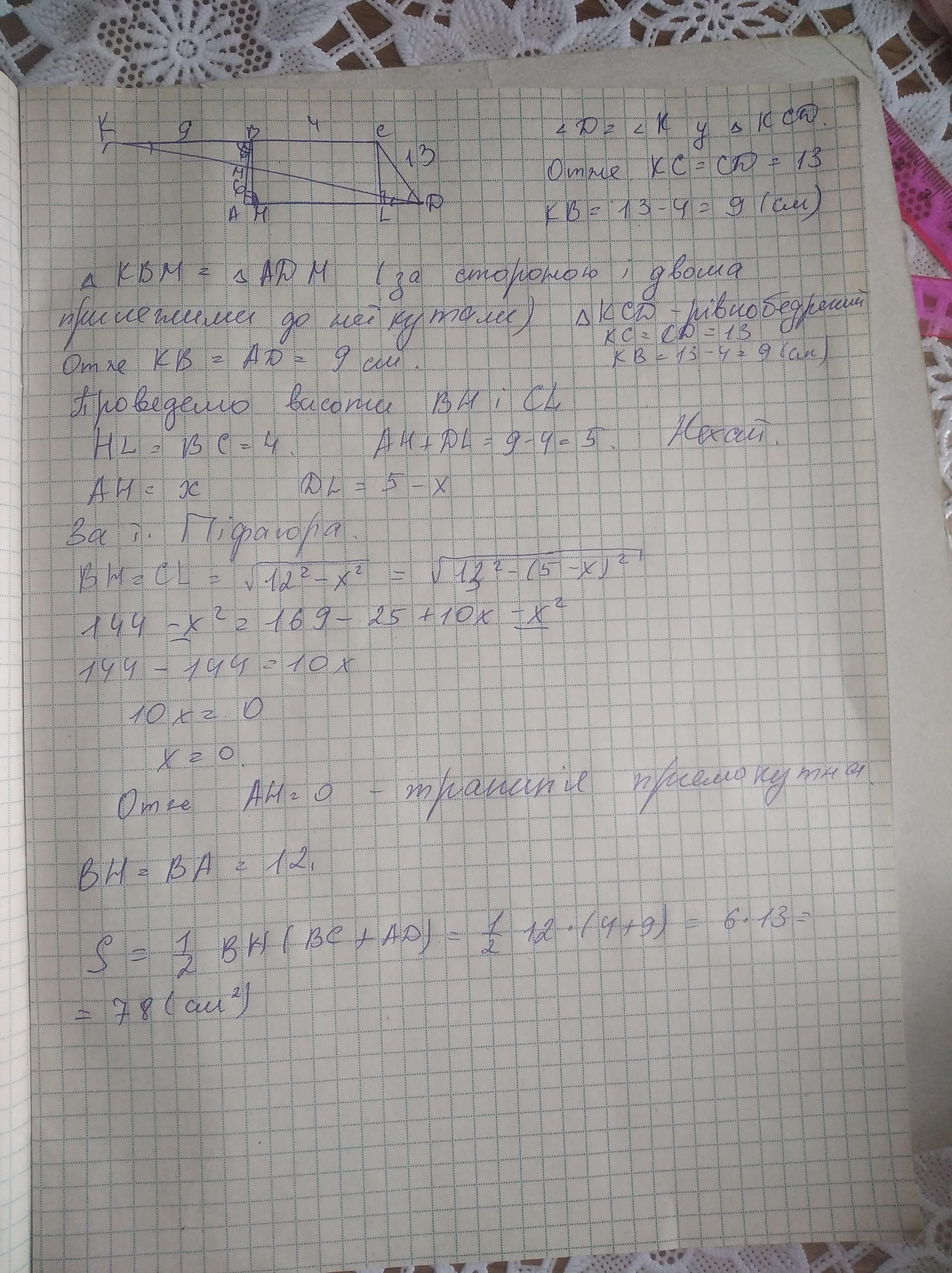 ВС = KD = 4 , BK = CD = 13 → AK = AD – KD = 9 - 4 = 5