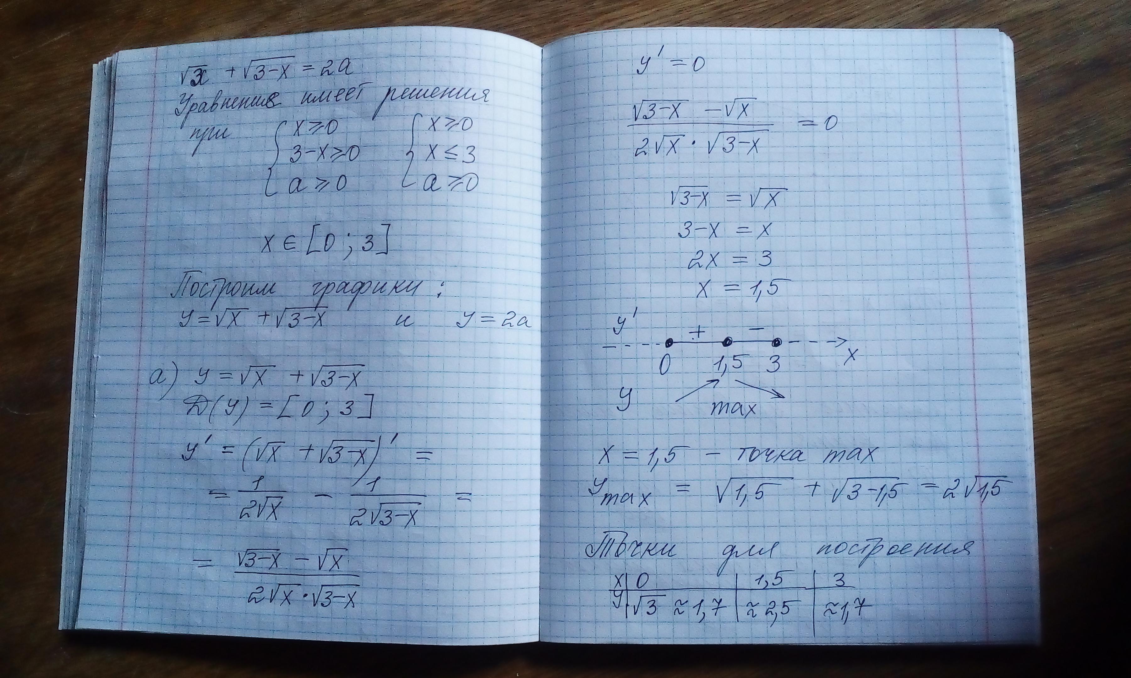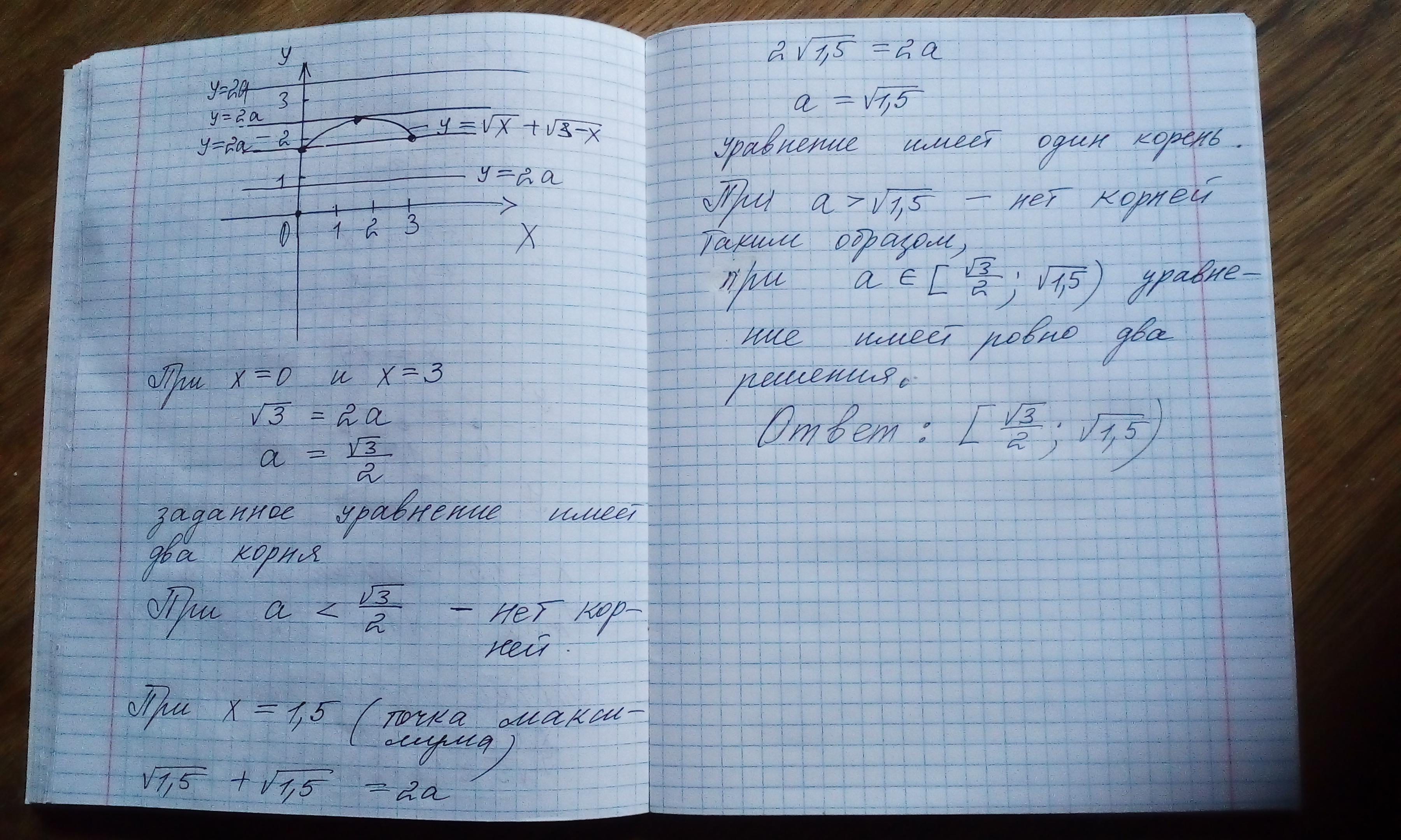 Найдите все значения параметра a, при каждом из которых уравнение sqrtx+sqrt(3-x)=2a имеет ровно два решения.