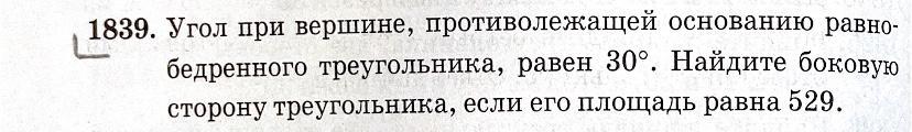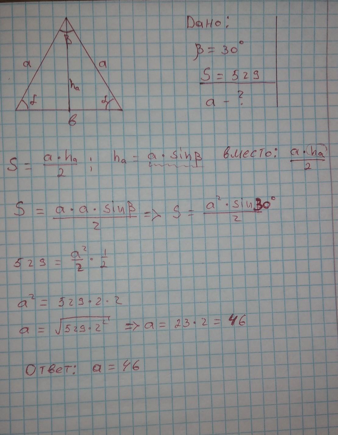 Площа трикутника АВС дорівнює 1/2 АК*ВС , так як ВС=АВ, замінемо ВС на АВ. Висота АК=4/2 ВА, як катет , що лежить проти кута в 30° , підставимо і вирішимо: S площа=1/2*1/2 ВА²=1/4 ВА² 4S=ВА²=4*529=√2116=46 Відповідь: сторона рівнобедреного трикутника дорівнює 46