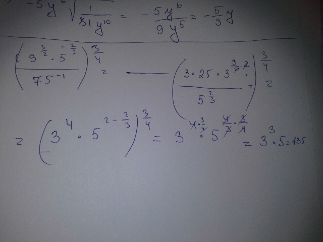 в скобках в числителе 9 в степени 3/2 умножить на 5 в степени -2/3 в знаменателе 75 в -1 степени и все это за скобками в степени 3/4