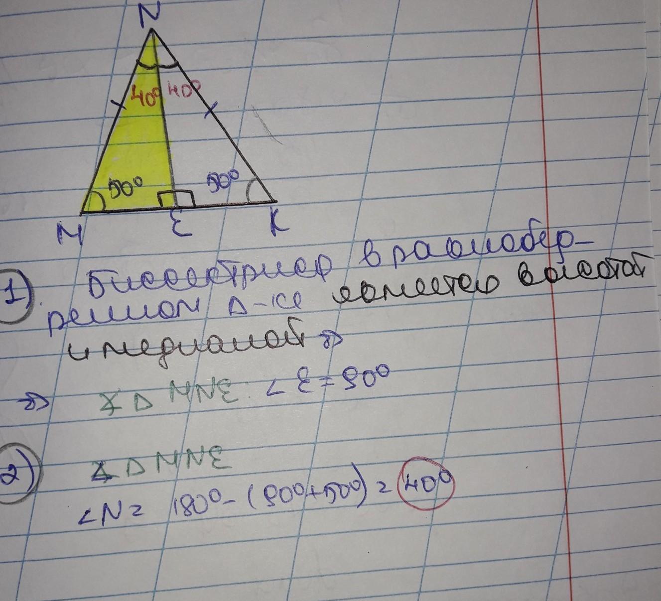 В равнобедренном треугольнике MNK MN = NK, NE – биссектриса, ∠M = 50°. Найди углы треугольника MNE.