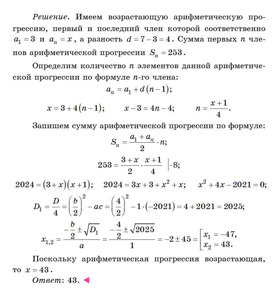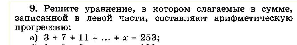 Решите уравнение , в котором слагаемые в сумме, записанной в левой части, составляют арифметическую прогрессию.