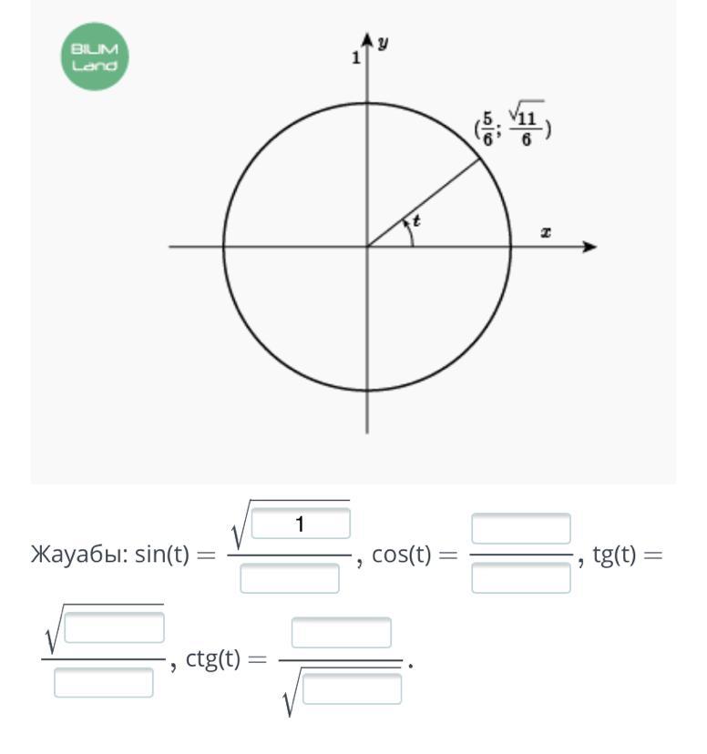 Окружность единичная, значит r=1, x=5/6, y=V11 /6 (V-корень)