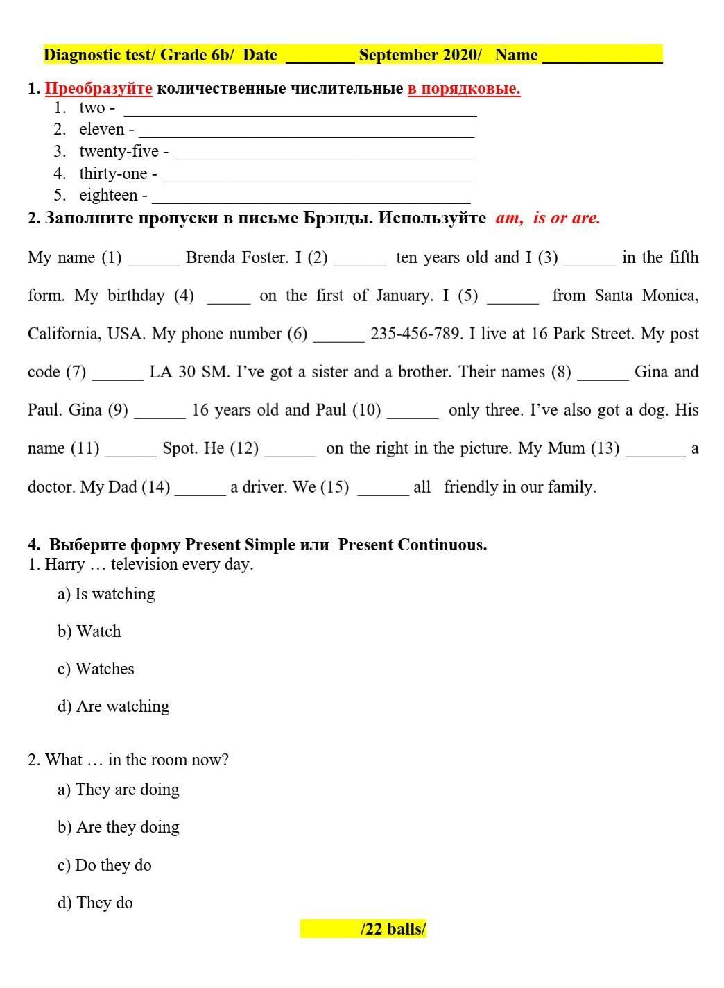 My name (1) is Brenda Foster. I (2) am ten years old and I (3) am in the fifth form. My birthday (4) is on the first of January. I (5) am from Santa Monica, California, USA. My phone number (6) is 235-456-789. I live at 16 Park Street. My post code (7) is LA 30 SM. I've got a sister and a brother. Their names (8) are Gina and Paul. Gina (9) is 16 years old and Paul (10) is only three. I've also got a dog. His name (11) is Spot. He (12) is on the right in the picture. My Mum (13) is a doctor. My Dad (14) is a driver. We (15) are all friendly in our family.