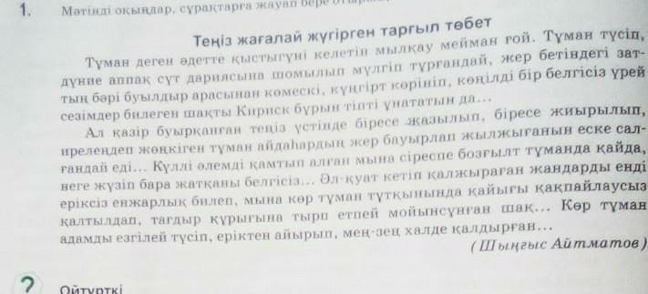 7-сынып Тұманның пайда болуы: 1- тапсырма.Мәтінді оқыңдар,сұрақтарға жауап бере отырып,ой бөлісіңдер:1)Автор қыстыгүні түсетін тұманның қандай ерекшеліктерін көрсеткен?Неліктен тұманды "мылқау мейман" деп атаған? 2)Тұманды күнгі өз көңіл күйлеріңді сипаттаңдар.