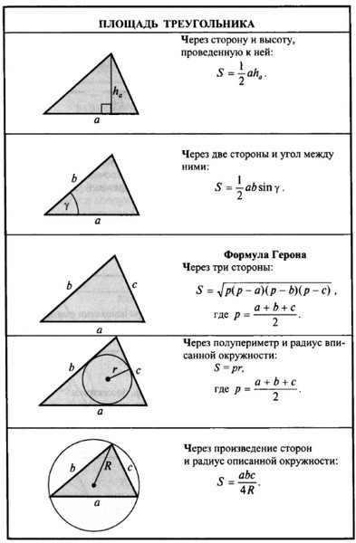 Все зависит от того, какие величины даны в треугольнике для нахождения площади.