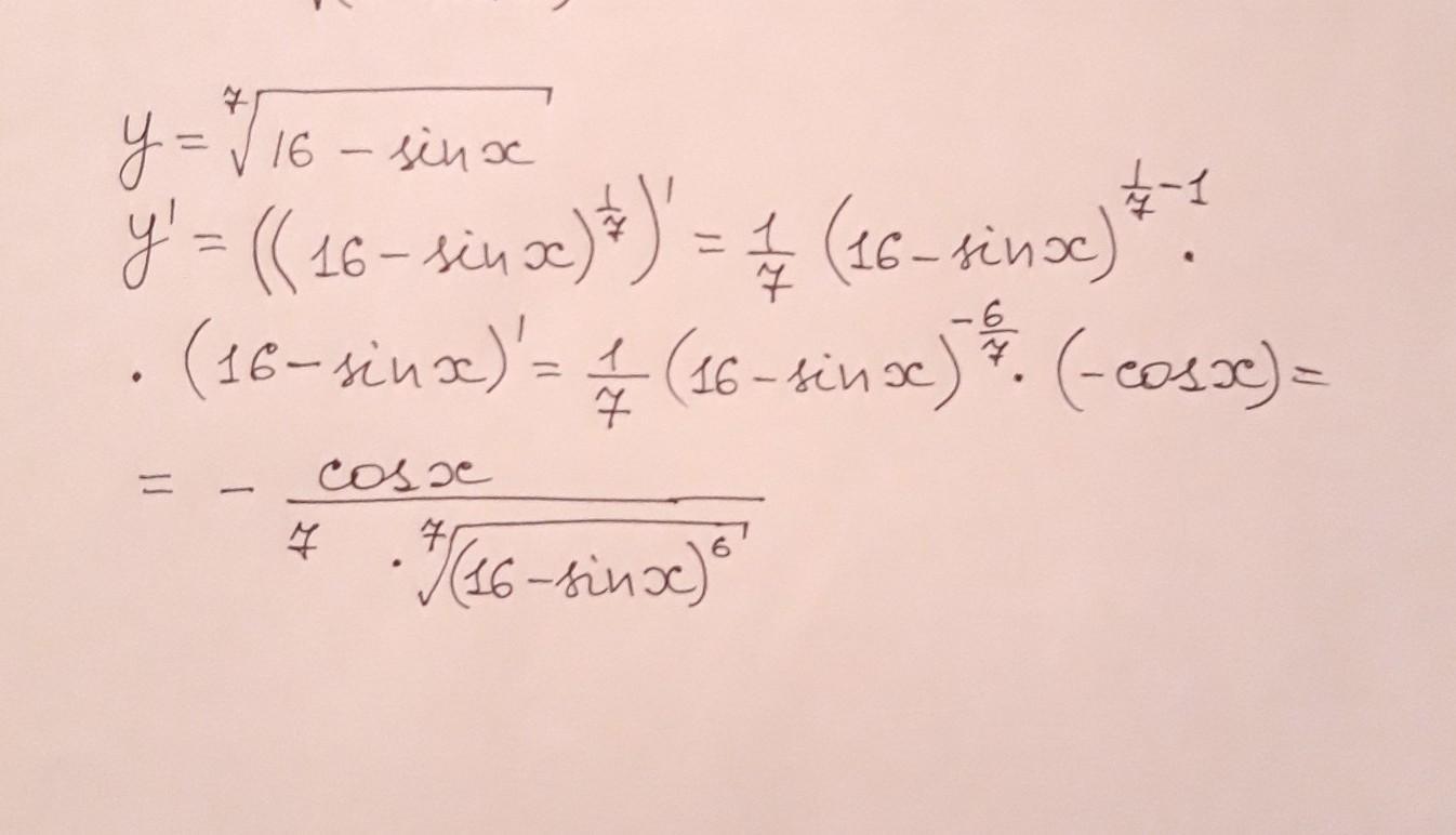y'=((16-sinx)¹/⁷)'=(1/7)*(16-sinx)⁻⁶/⁷*(16-sinx)'=(-cosx)*(1/7)*(16-sinx)⁻⁶/⁷=