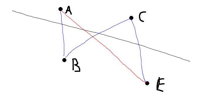 Отрезки AB,BC и CE пересекают данную прямую, а их концы не лежат на ней. Пересекает ли эту прямую отрезок AE?