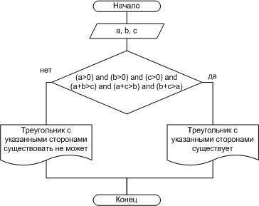 Блок-схема.Даны три положительных числа. Составить алгоритм, определяющий, могут ли они быть длинами сторон треугольника.