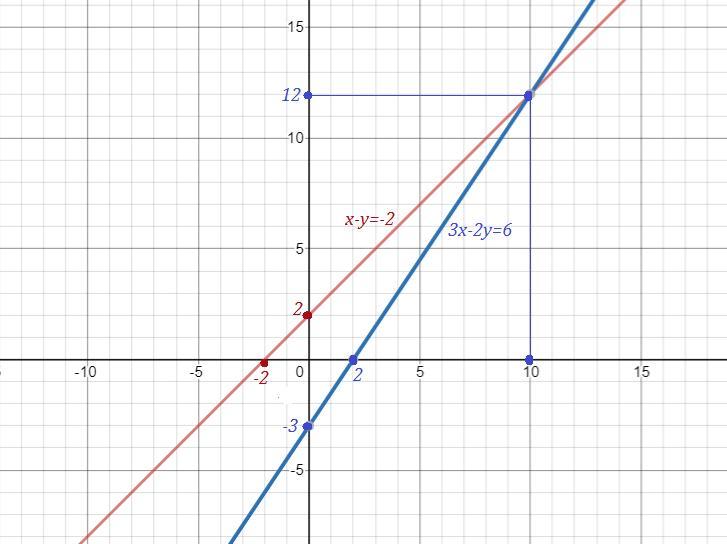 Точка пересечения прямых (10,12) . Значит решение системы: (10,12) .