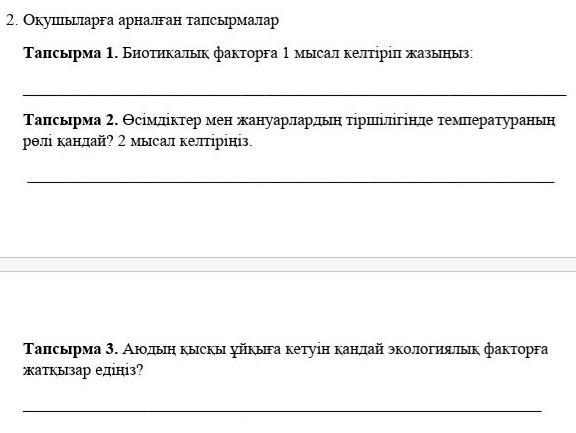 Тапсырма1:Биотикалық фактор, биогендік фактор — ағзалардың тіршілік әрекетіне байланысты бір-біріне тигізетін сан алуан әсерлері. Биотикалық фактордың абиотикалық фактордан айырмашылығы, мұнда әр түрге жататын азғалар бір-біріне өзара және айналадағы ортаға әсерін тигізеді. Мысалы, жәндіктер өсімдіктерді тозаңдандырады, бір ағза екінші бір ағзаны қорек етеді, микроорганизмдер топырақ құрылымын өзгертеді, т.б. Биотикалық факторлар бір популяция ішіндегі дара бастар арасында да, жеке популяциялар арасында да байқалады. Мысалы, ақ бөкендердің жайылымдардағы өсімдіктерге әсері, ақ бөкендердің өзара әсері немесе қасқырдың ақ бөкенге шабуылы, т.б. Биотикалық фактор түрішілік және түраралық болып ажыратылады.