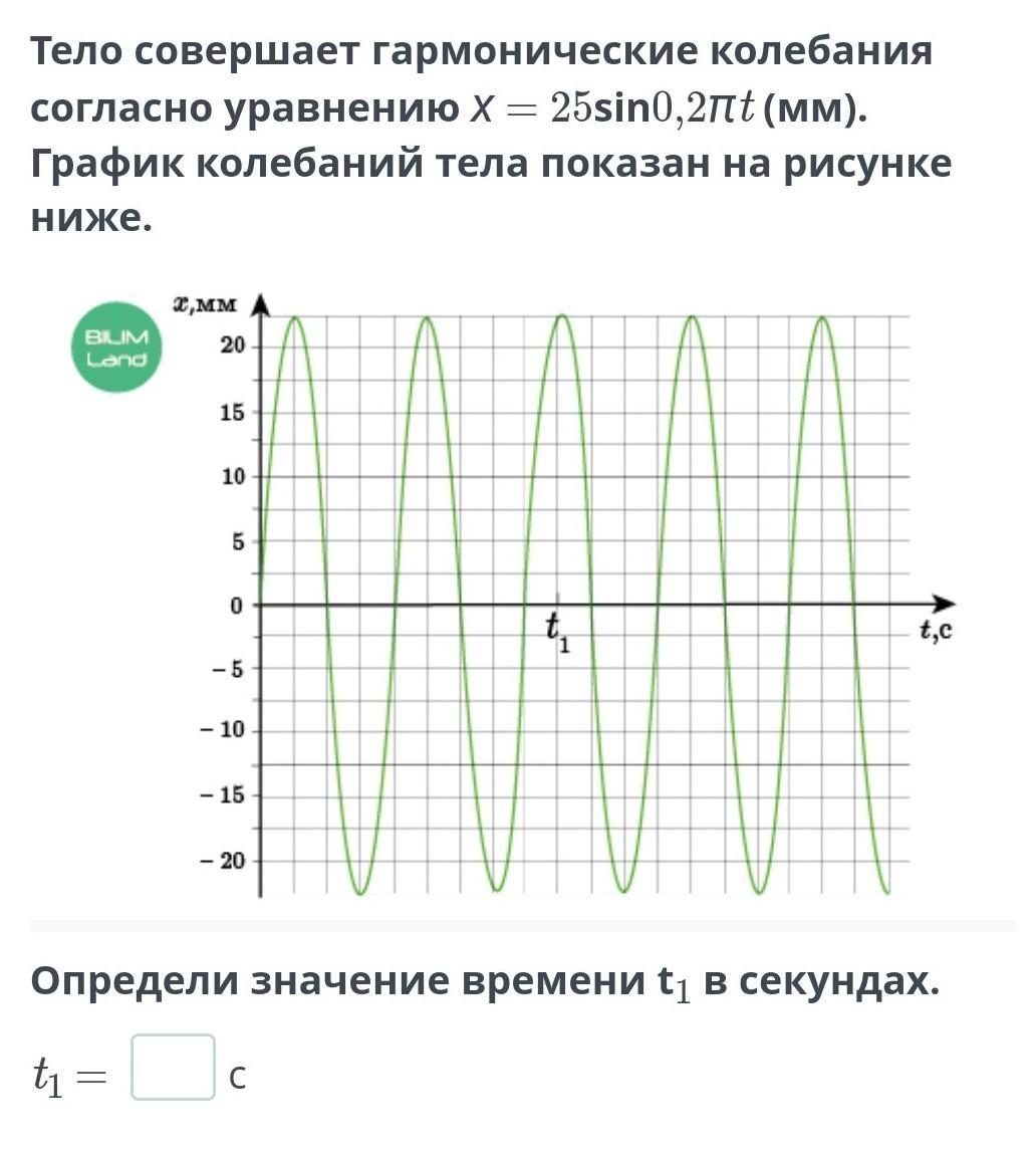 Тело совершает гармонические колебания согласно уравнению х = 25sin0,2πt (мм). График колебаний тела показан на рисунке ниже.