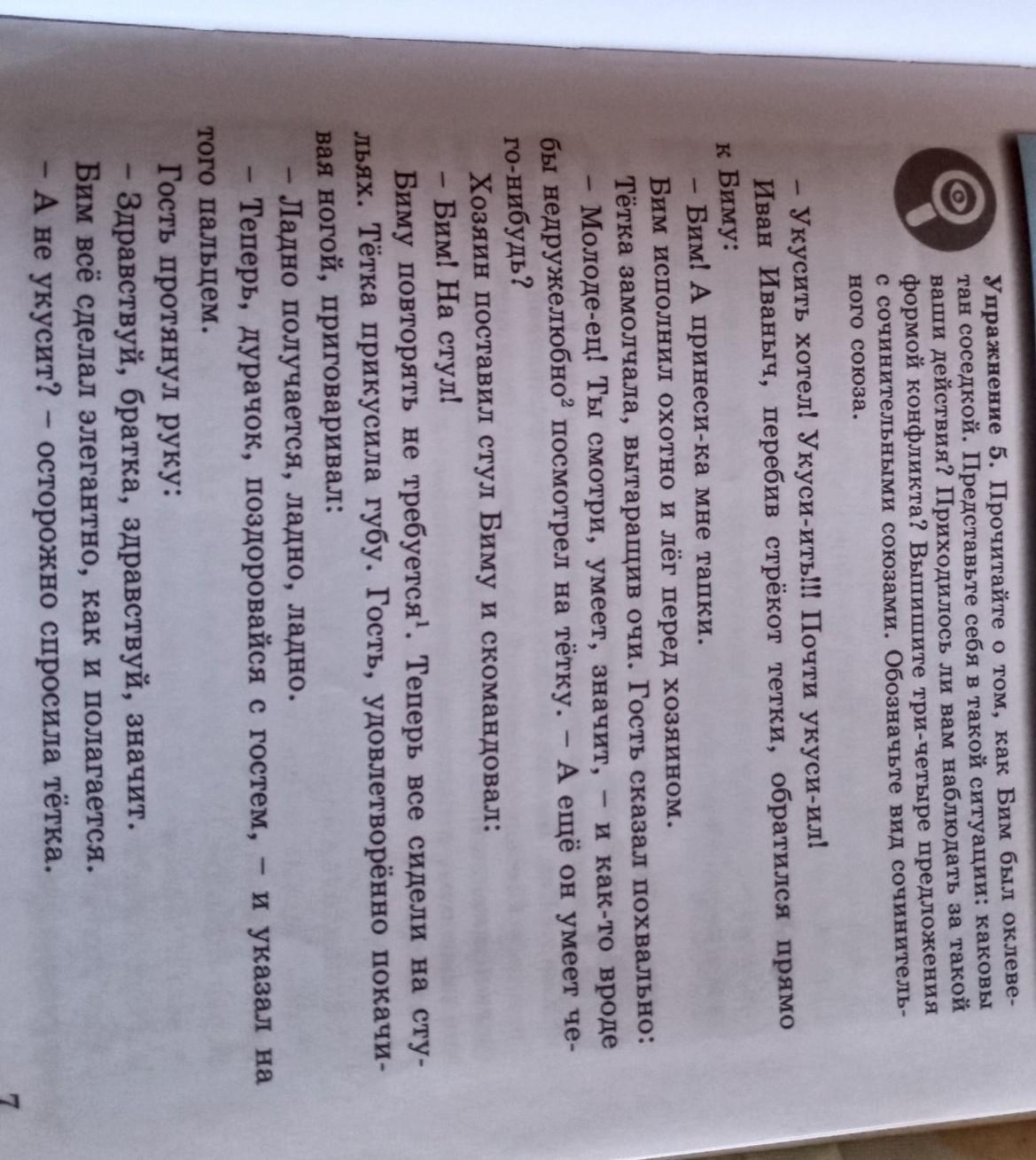 Прочитайте о том, как Бим был оклеветан соседкой Представьте себя в такой ситуации: каковы ваши действия ? Приходилось ли вам наблюдать за такой формой конфликта? Выпишите три-четыре предложения с сочинительными союзами. Обозначьте вид сочинительного союза.
