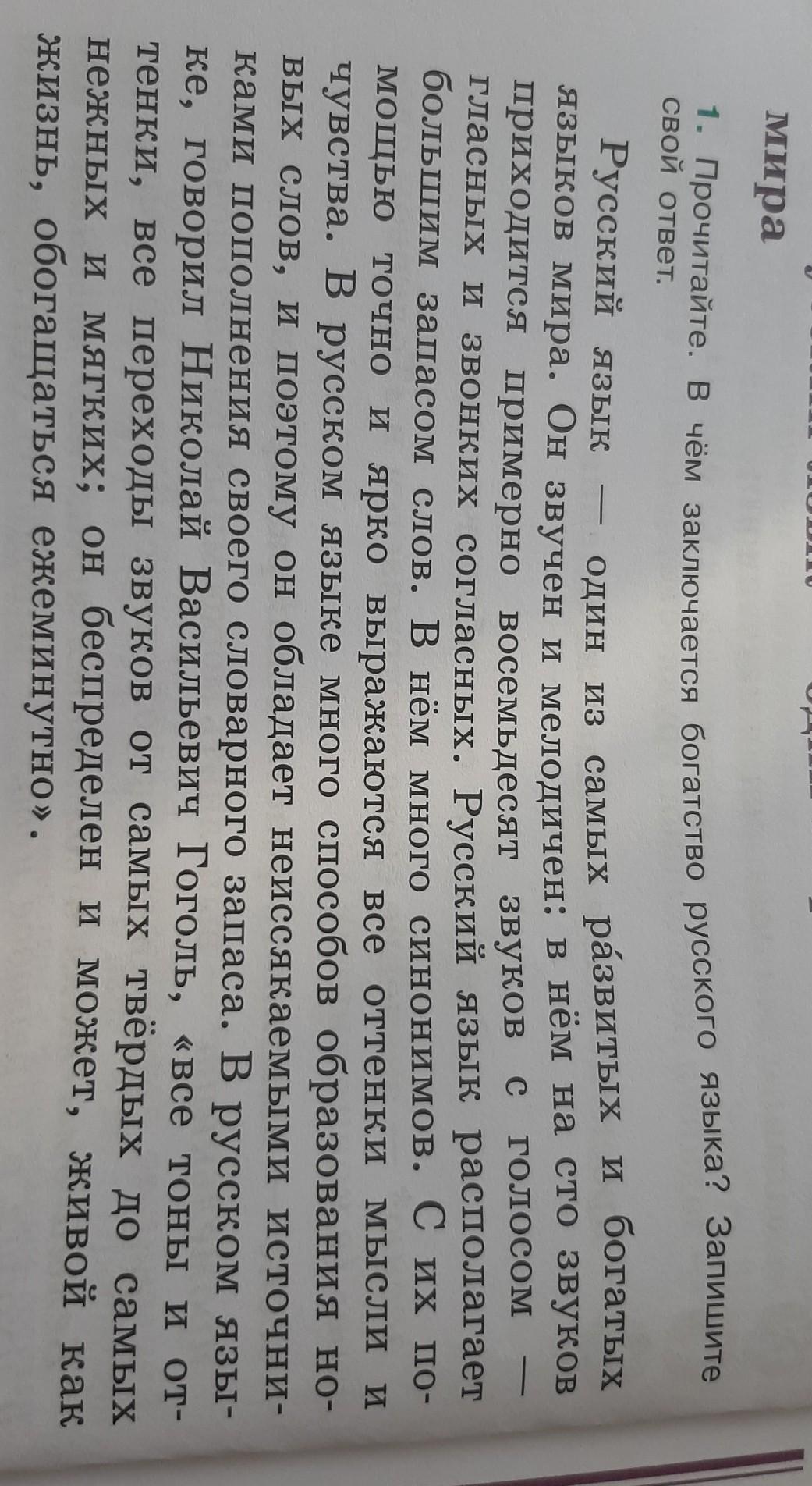 Богатство руского языка заключяеться в том что он наш родной язык и это и есть нашо богатство