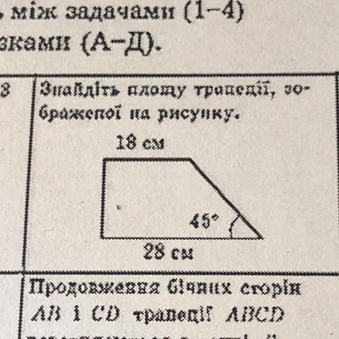 Короче потрібно провести перпендикуляр з кінця відрізка 18 см до відрізка 28 см і у нас утвориться прямокутний трикутника оскільки один з кутів прямокутного трикутника 45 градусів то і інший кут буде також 45 градусів і цей трикутник буде рівнобедреним.... І короче там зназу перппндикуляр поділить відрізок 28 см на частини і той новий відрізок буде 10 см так само як і перппндикуляр..... S = 1/2 * a * h