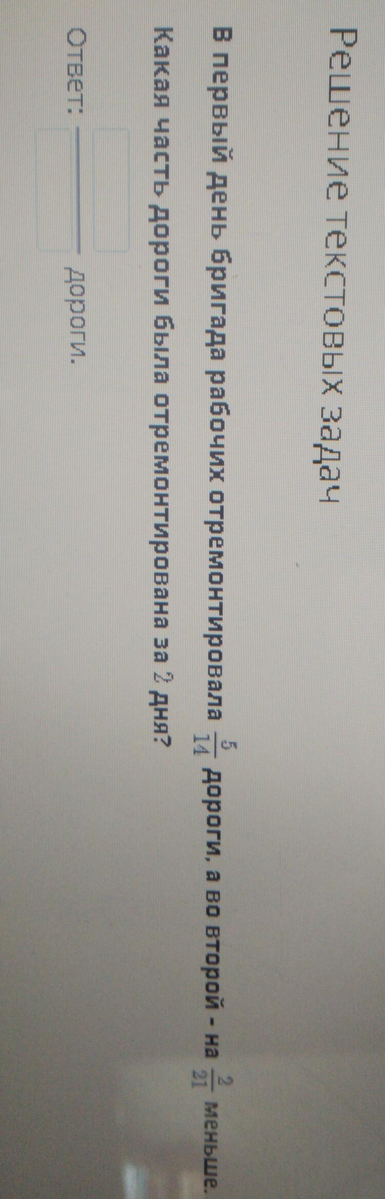 1) 5/14 - 2/21=15/42 - 4/42=11/42(часть) - отремонтировали во второй день