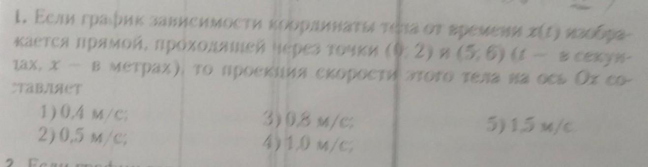 Па данным задачи за 5 с тело сместилось их точки хо=2 м в точку х=6 м, тогда Vx=(x-xo)/t=(6-2)/5=4/5=0,8 м/с.