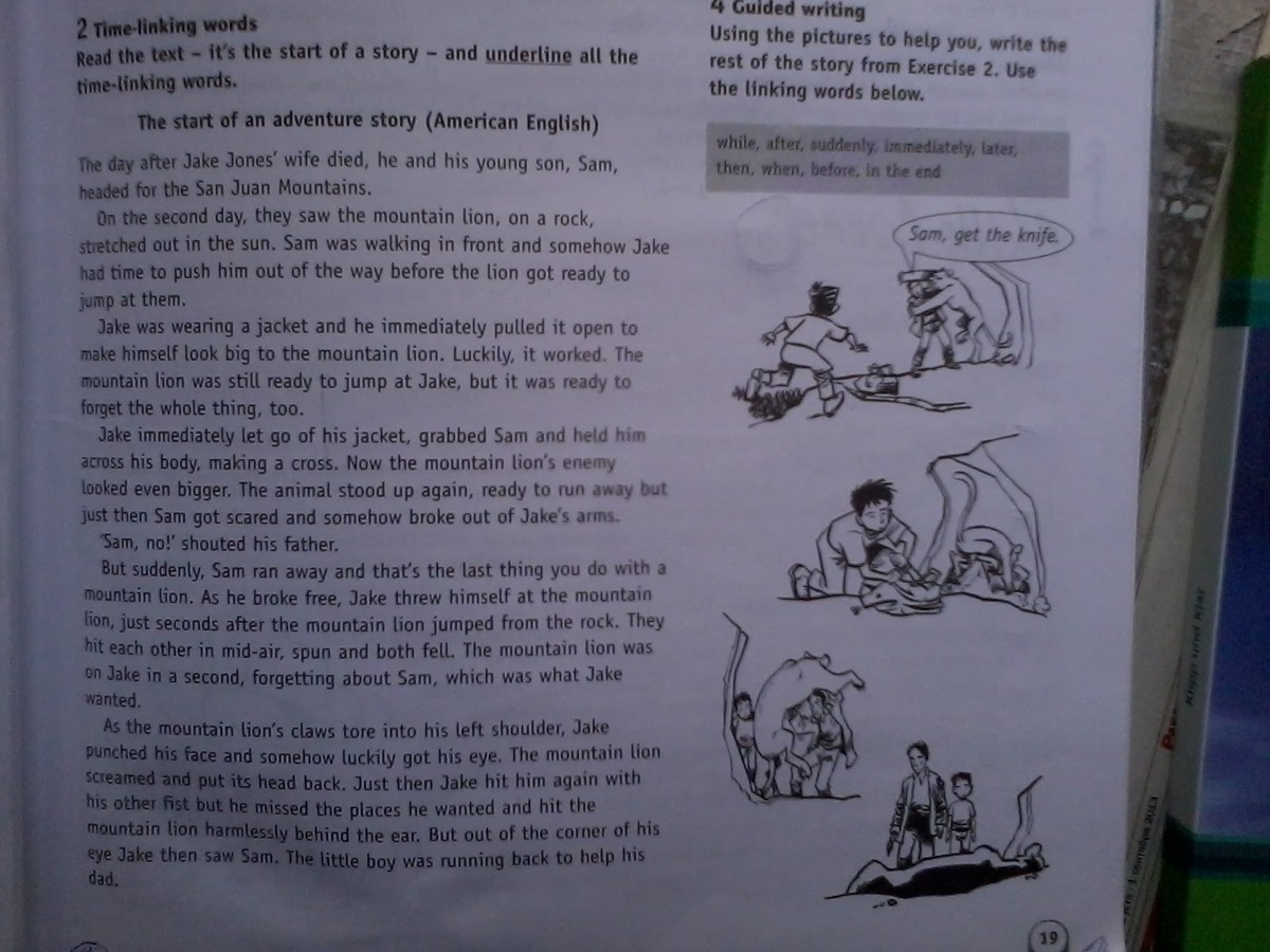 As he was running to help his father the mountain lion attacked his father. Sam heard his father screaming: "Bring a knife, Sam!" Sam started looking for a knife in a travel bag of his father. The mountain lion pressed his father to the ground. Sam was scared. He found a knife and immediately ran to help. Sam handed the knife to his father and he had hit the mountain lion several times. The mountain lion fell to the ground. In the end, people were still alive, but they would never be able to forget that terrible battle.