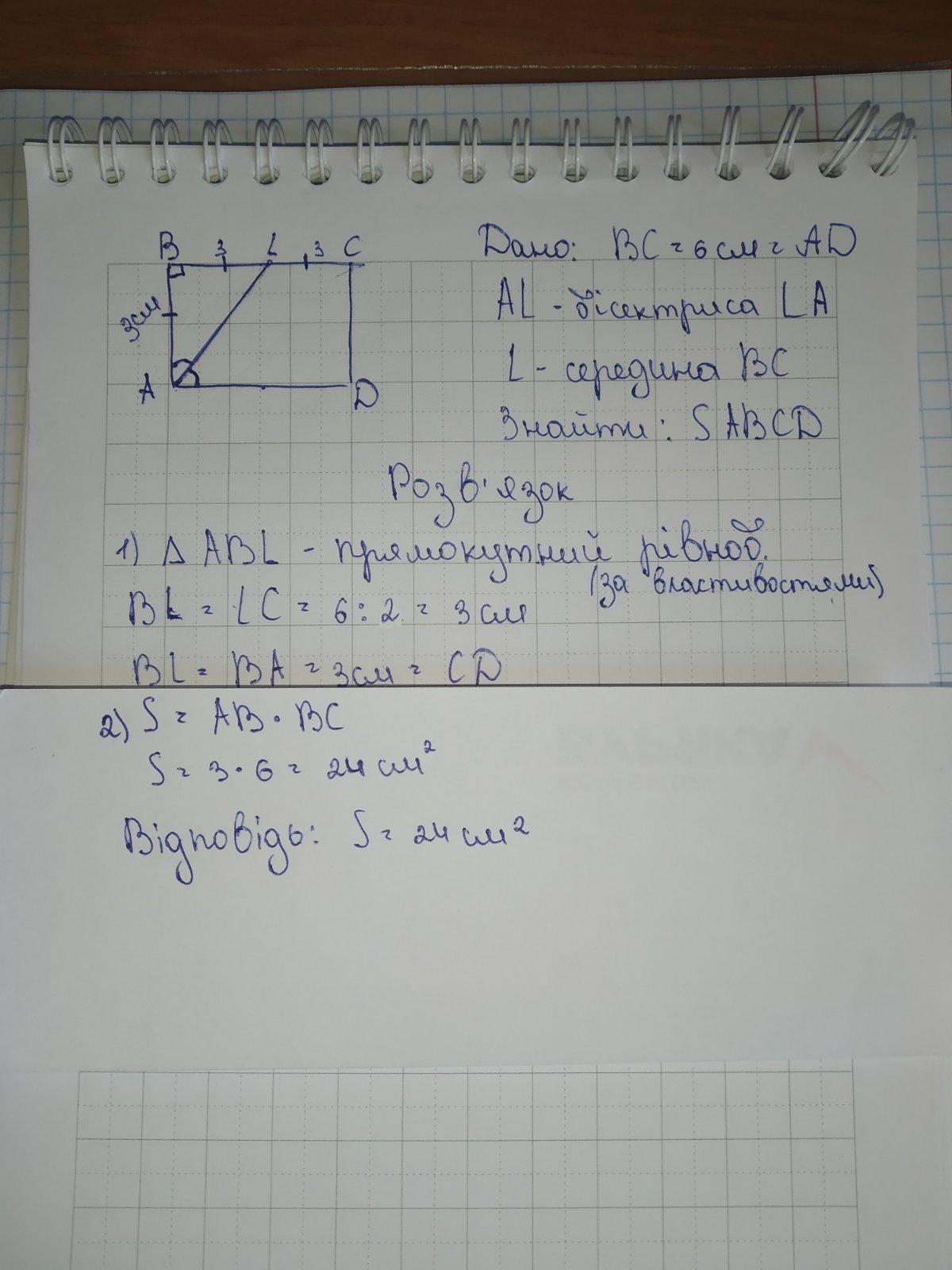 у прямокутника ABCD : BC= 6 см , AL бісектриса кута А , точка L — середина сторони ВС. Знайти площу прямокутника