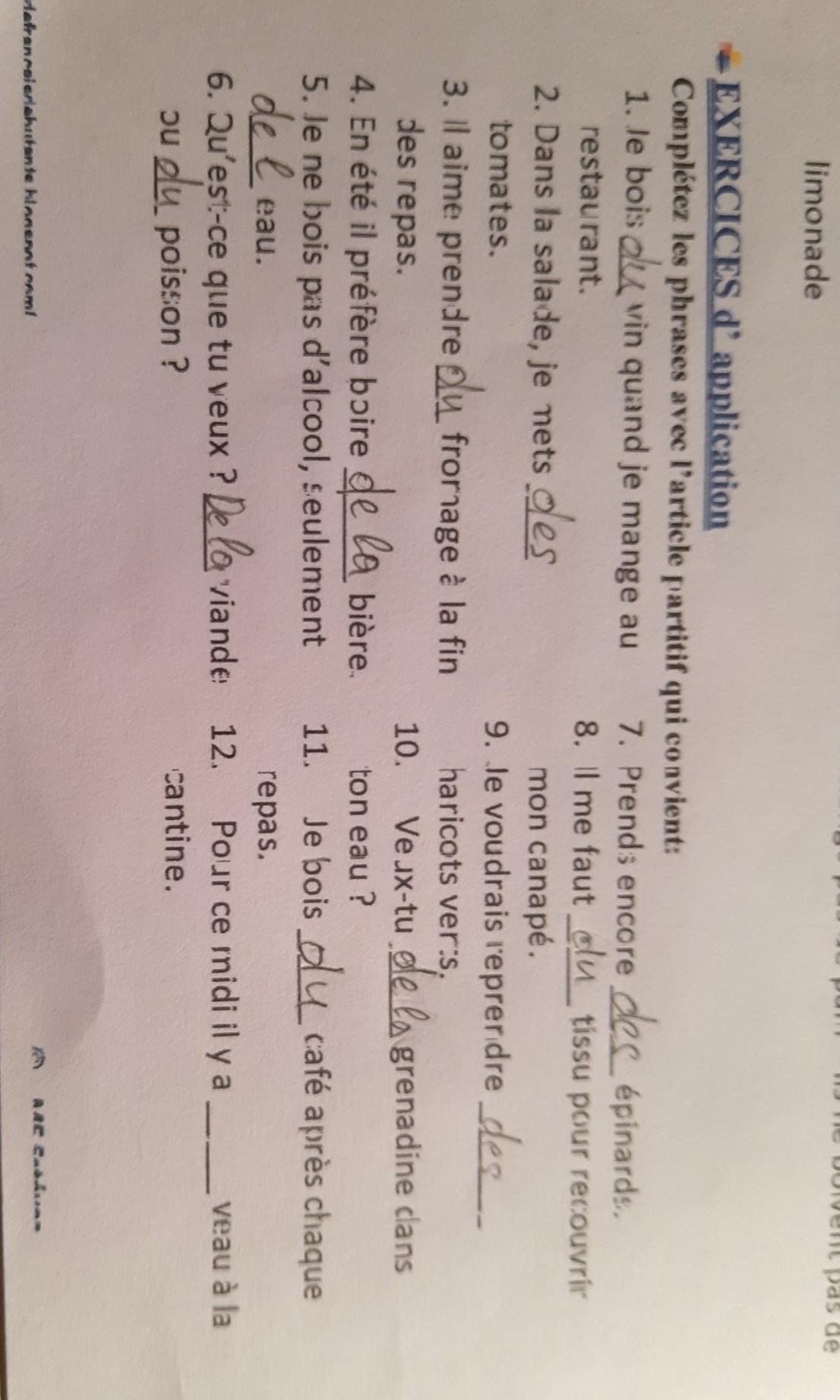ОЧЕНЬ СРОЧНО!!!! Знатоки французского!!! Нужна Ваша помощь!!! Вставьте: de, du, de la, des, de l’: 1. Je bois ___ vin quand je mange au restaurant. 2. Dans la salade, je mets ____ tomates. 3. Il aime prendre ___ fromage la fin des repas. 4. En t il prfre boire _ bire. 5. Je ne bois pas dalcool, seulement ____ eau. 6. Quest-ce que tu veux ? ____ viande ou ___ poisson ? 7. Prends encore _____ pinards. 8. Il me faut _____ tissu pour recouvrir mon canap. 9. Je voudrais reprendre _ haricots verts. 10. Veux-tu _____ grenadine dans ton eau ? 11. Je bois _____ caf aprs chaque repas. 12. Pour ce midi il y a _____ veau la cantine.