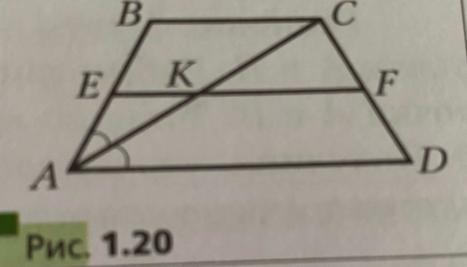 диагональ АС делит трапецию на 2 треугольника: АВС и АСД. Рассмотрим полученный ∆АСД. Так как точка Е - середина отрезка АВ, то точка F будет середина отрезка СД, следовательно EF является средней линией трапеции. Тогда KF будет являться средней линией ∆АСД (по теореме Фалеса: если прямая отсекает равные отрезки на одной стороне угла, то она отсекает равные отрезки и с другой стороны этого угла). По правилу треугольника его средняя линия=½ его основания, поэтому КF=½АД, или АД=2KF=5×2=10см