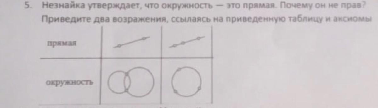 Незнайка утверждает ,что окружность -это прямая.Почему он не прав? Приведите два возражения,ссылаясь на приведённую таблицу и аксиомы