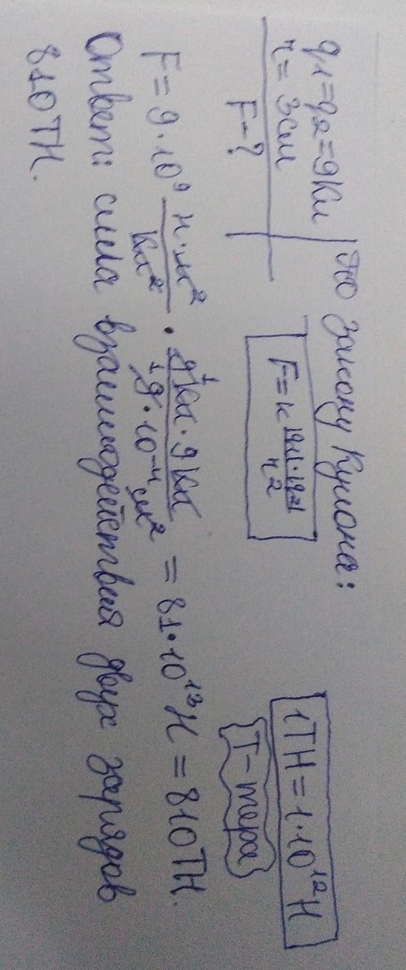 найдите силу взаимодействия двух зарядов по 9 кл каждый, если они находятся на расстоянии 3 см друг от друга