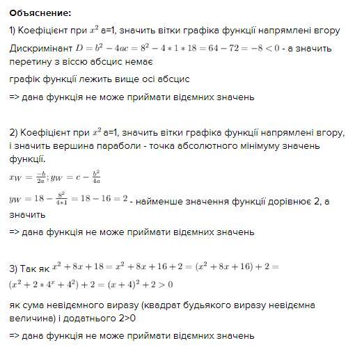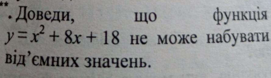 доведи,що функция у=х2(это в квадрате) + 8х+18 не може набувати вид'емних значень. пожалуйста помогите. спасибо