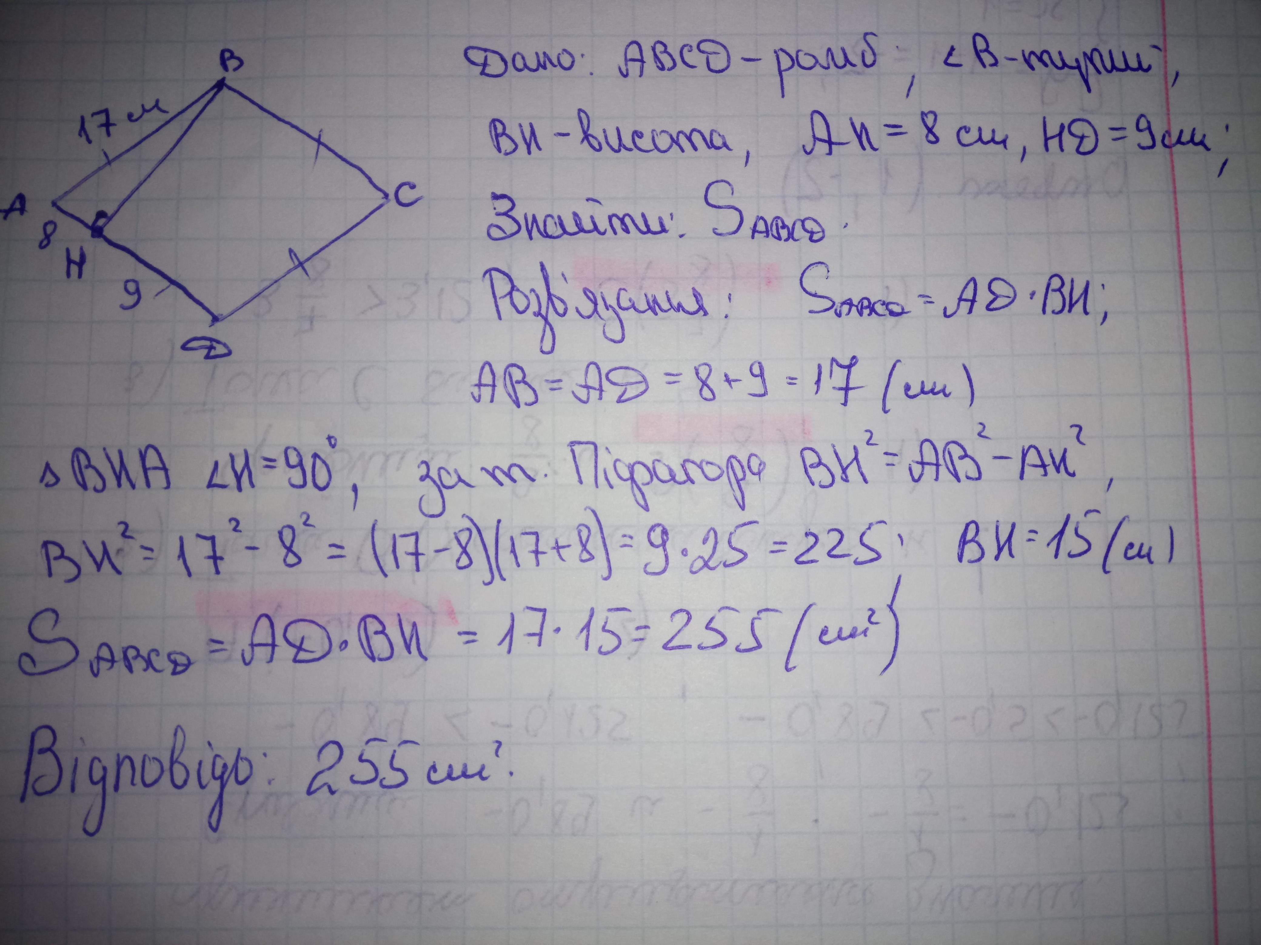 Висота ромба проведена з вершини тупого кута ділить сторони ромба на 8 і 9 см знайти площу ромба