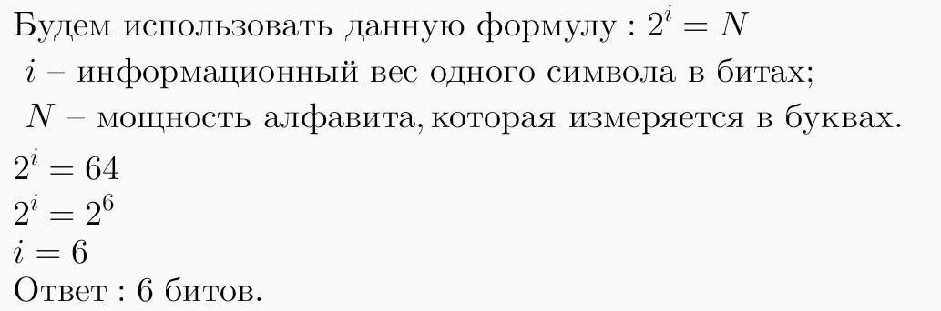 В алфавите 64 буквы. Каков информационный вес одного символа? Выбери из списка правильный вариант ответа. 8 битов 4 бита 32 бита 5 битов 6 битов